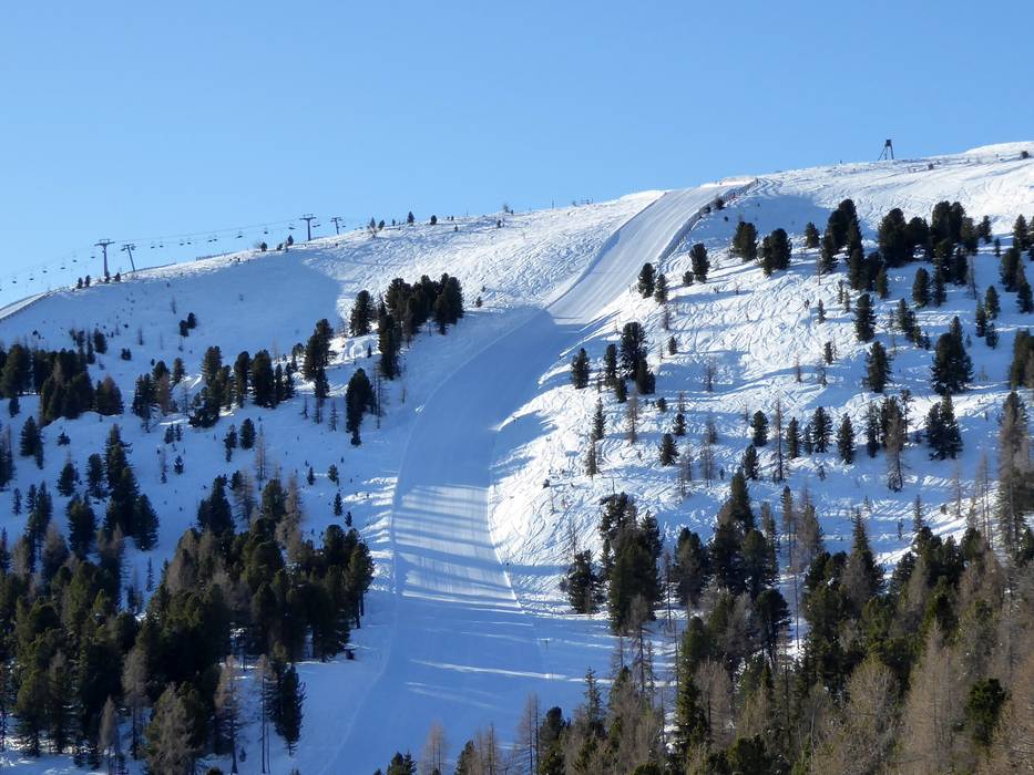 Entlang der Kreischberg 10er Gondelbahn 1. Sektion: Die schwarze Piste 1 zur Talstation verzweigt im unteren Bereich und bietet somit mehrere Abfahrtsmöglichkeiten.