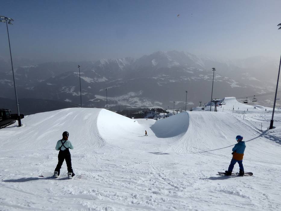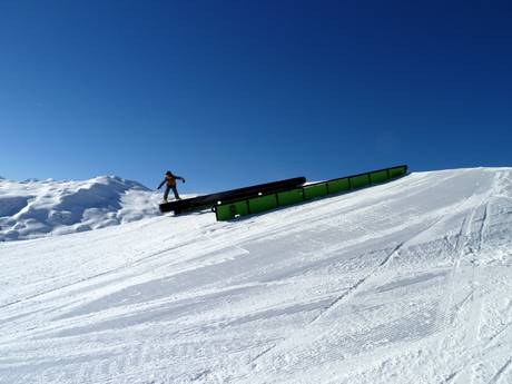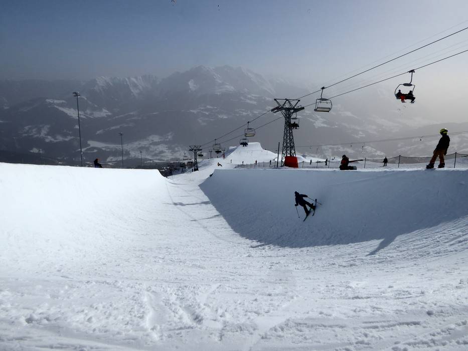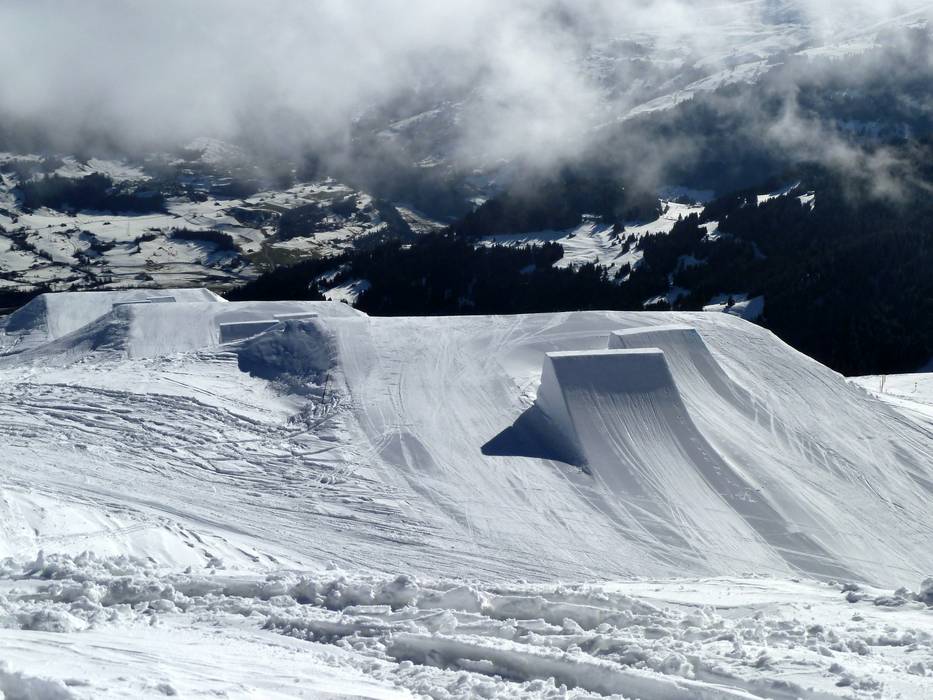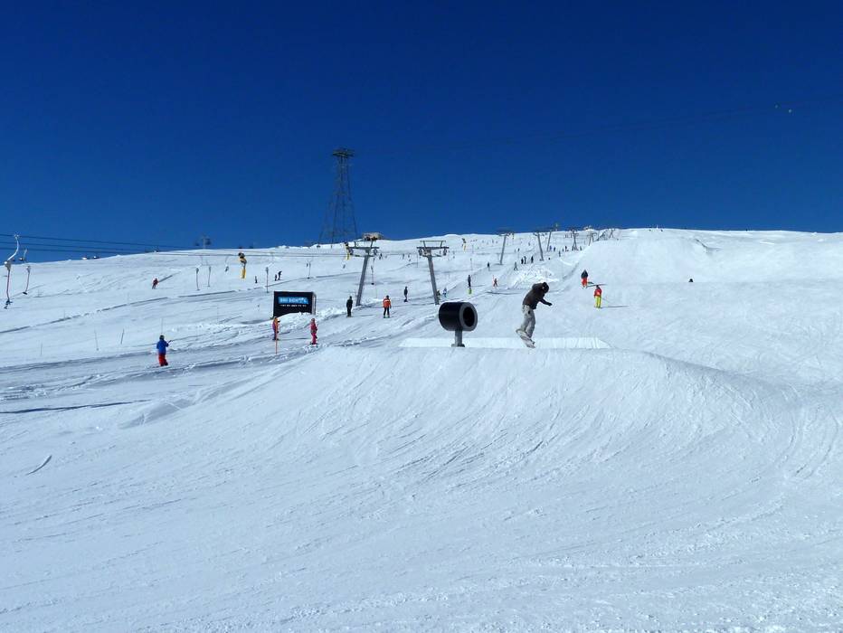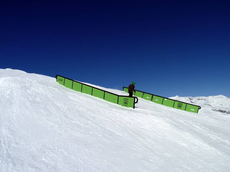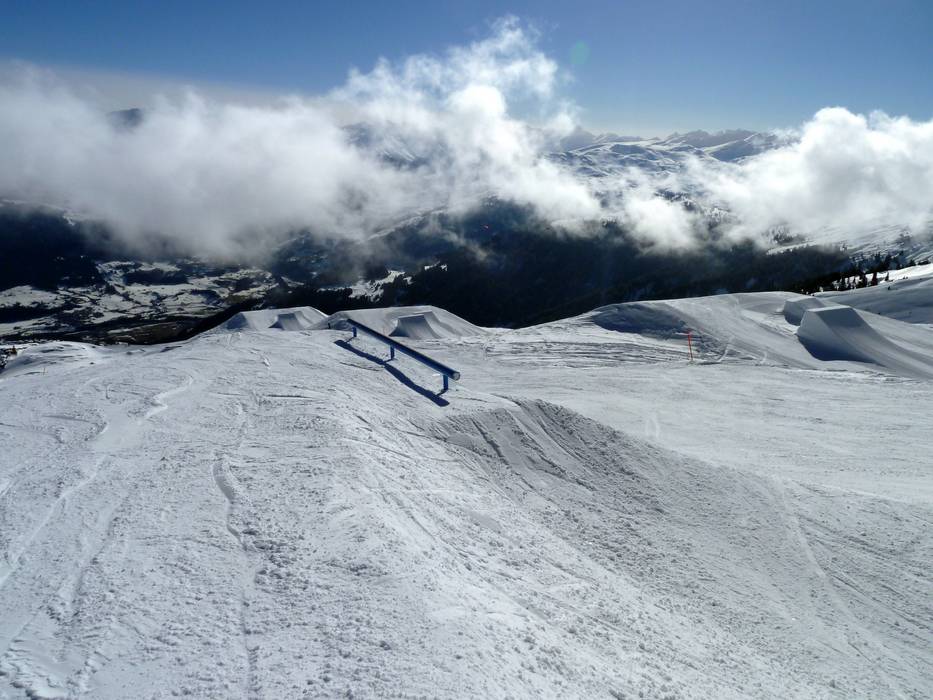 Der einfachste Snowpark in Laax. Es gibt diverse einfache Boxen und Kicker.