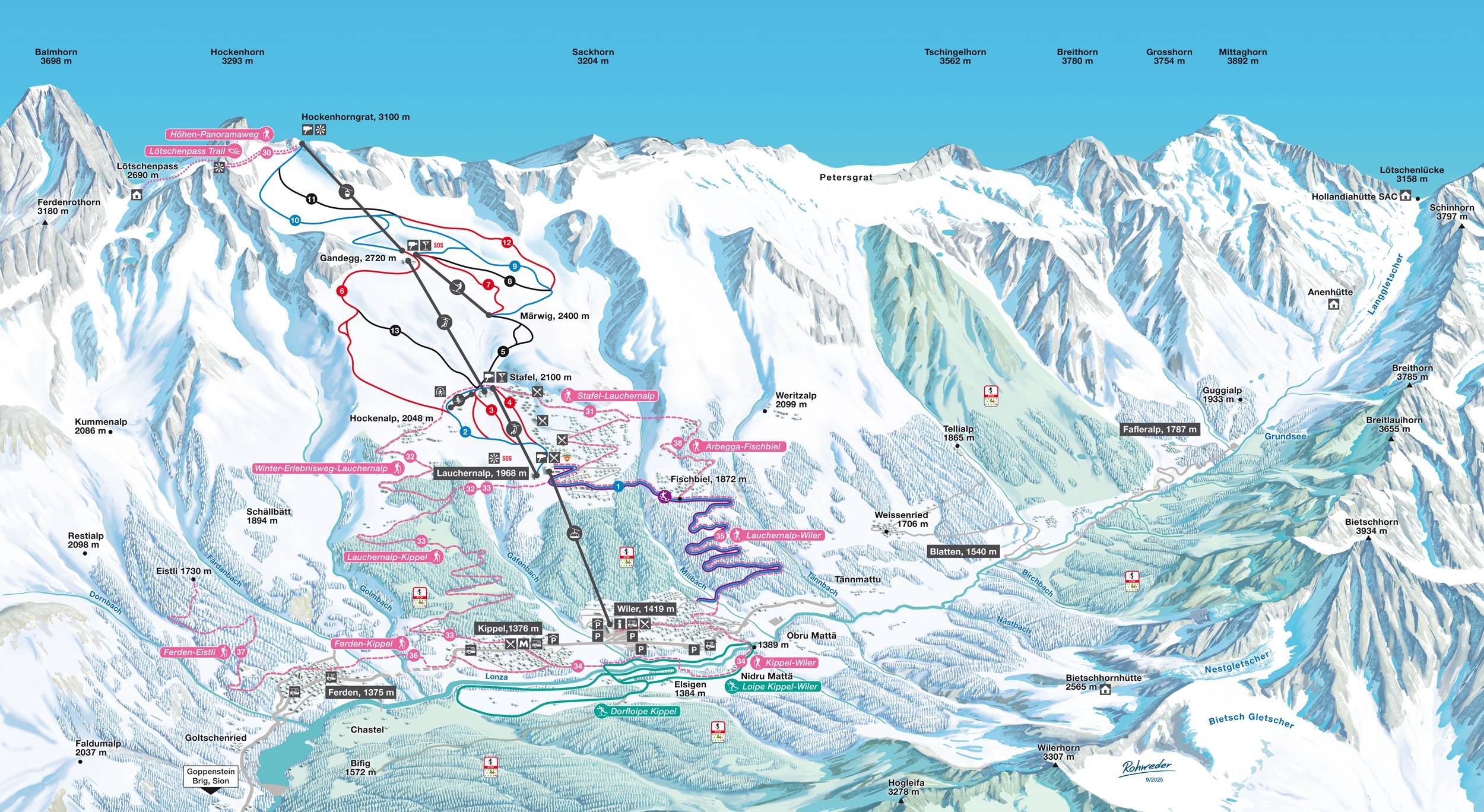 Der Pistenplan bildet das Skigebiet Lauchernalp sehr gut ab. Es sind alle Lifte und Pisten mit angegeben. Die Einkehrmöglichkeiten sind ohne Namen der Hütten/Restaurants eingezeichnet. Zusätzlich findet man Informationen zu den Winterwanderwegen und Loipen. Auf der Rückseite sind alle Informationen zum Sommer aufgeführt. An den Kassen und in den Hotels gibt es kleine Kärtchen mit dem Fahrplan der Seilbahn.