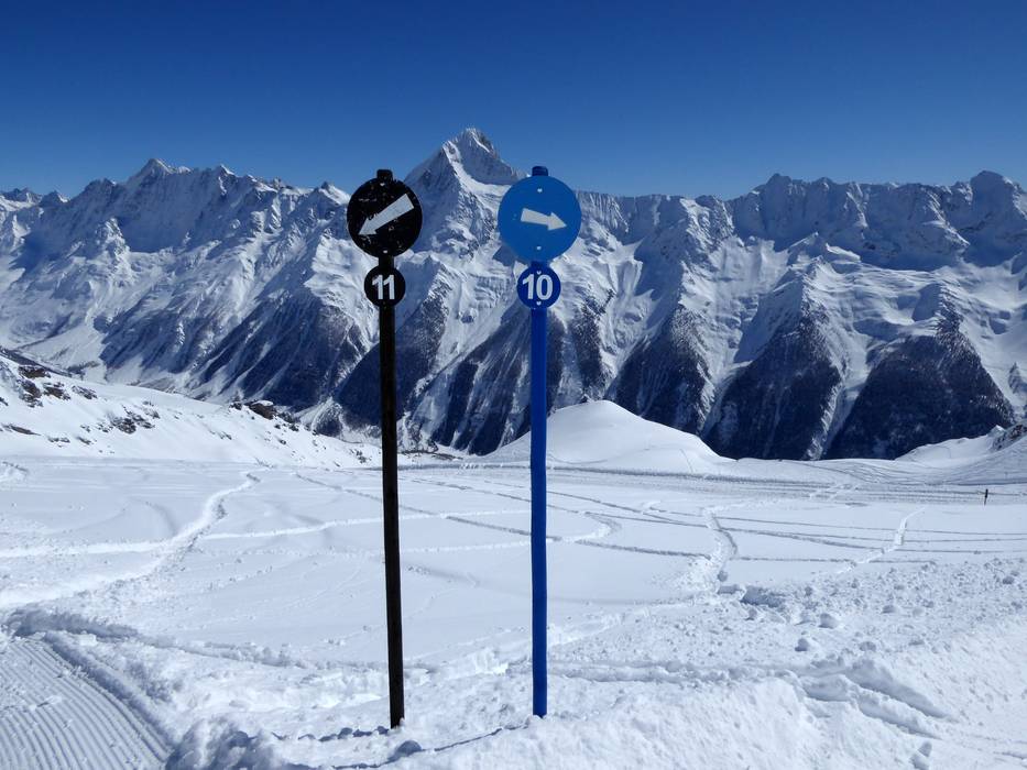 Die Pistenbegrenzungen sind vorbildlich. Pfeile markieren deutlich, wo sich die Pisten befinden. Informationstafeln mit aktuellem Status an der Talstation helfen bei der Orientierung. Ausschilderungen könnten ergänzt werden auf den Pisten. Am Hockenhorngrat auf 3111 m freuen sich die Skifahrer über Panoramakarten mit den Namen der umliegenden Bergen.