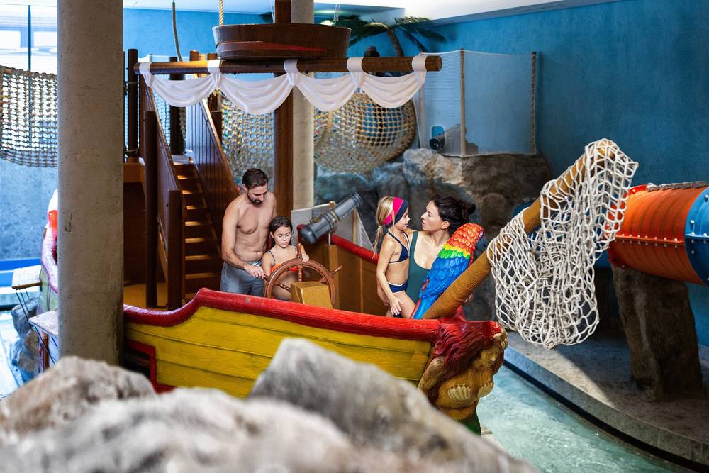 Die beliebte Wasser-Wunderwelt ist herrlich großzügig. Die In- und Outdoor-Pool-Area ist weitläufig angelegt. Zusätzlich gibt es einen weiteren sehr großen Kinder-Schwimmbereich mit zahlreichen Rutschen, Kidspool, Piratenschiff und Lazy River. Auf der 90 m langen Wasserrutsche vergessen selbst Mini-Meuterer das Meutern.