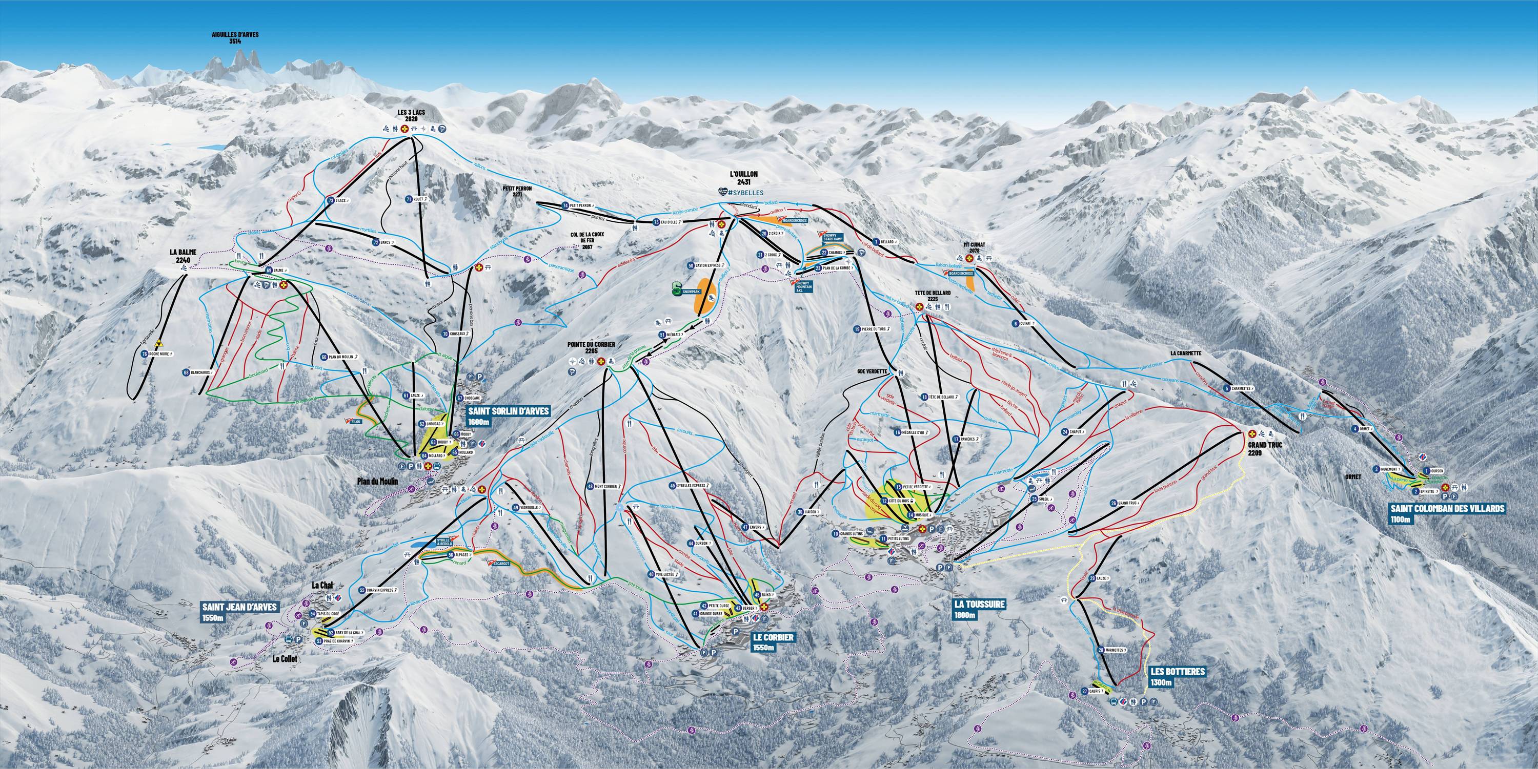 Orientierung (Pistenplan, Informationstafeln, Ausschilderung) und Sicherheit im Skigebiet Les Sybelles – Le Corbier/La Toussuire/Les Bottières/St Colomban des Villards/St Sorlin/St Jean d’Arves