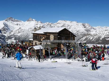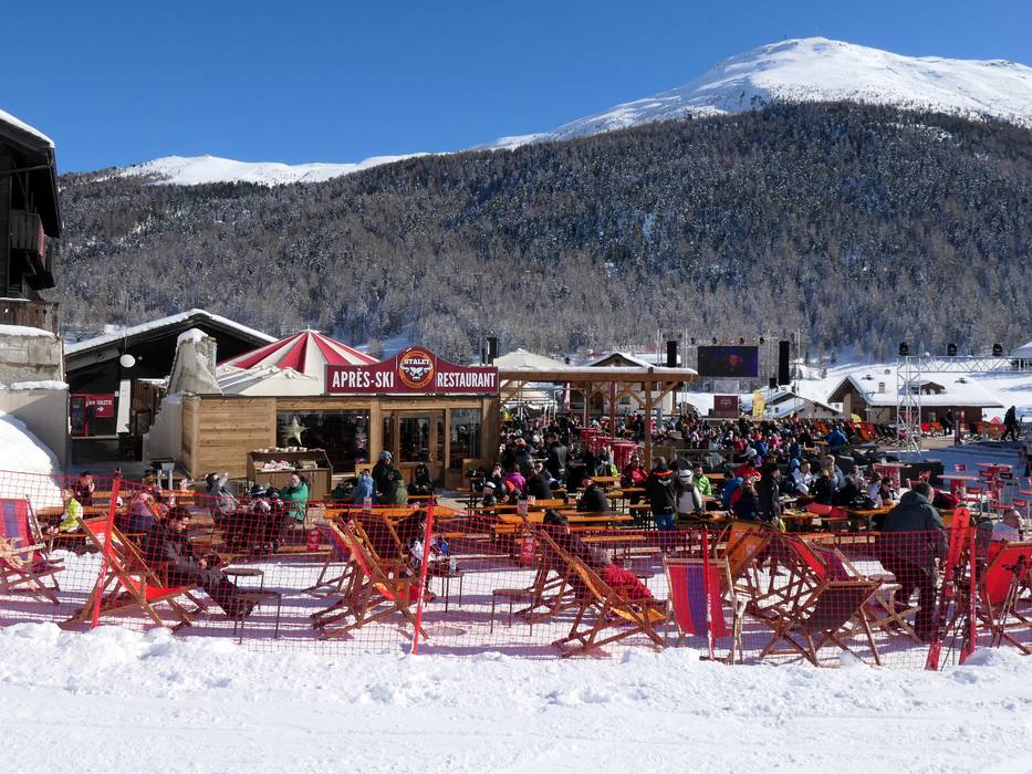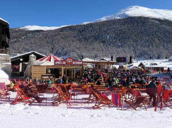 Livigno bietet einige sehr gute Après-Ski-Locations an den Talstationen und im Skigebiet. Sonnenterassen laden zum Verweilen ein. Im Ort Livigno kann man in zahlreiche Bars einkehren.