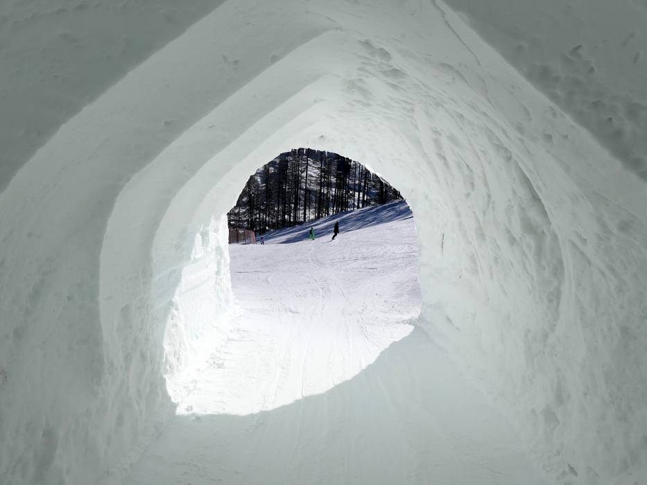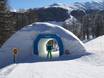 Die Fun Area bei der Gondelbahn Cassana bietet lustige Figuren und einen Schneetunnel.
