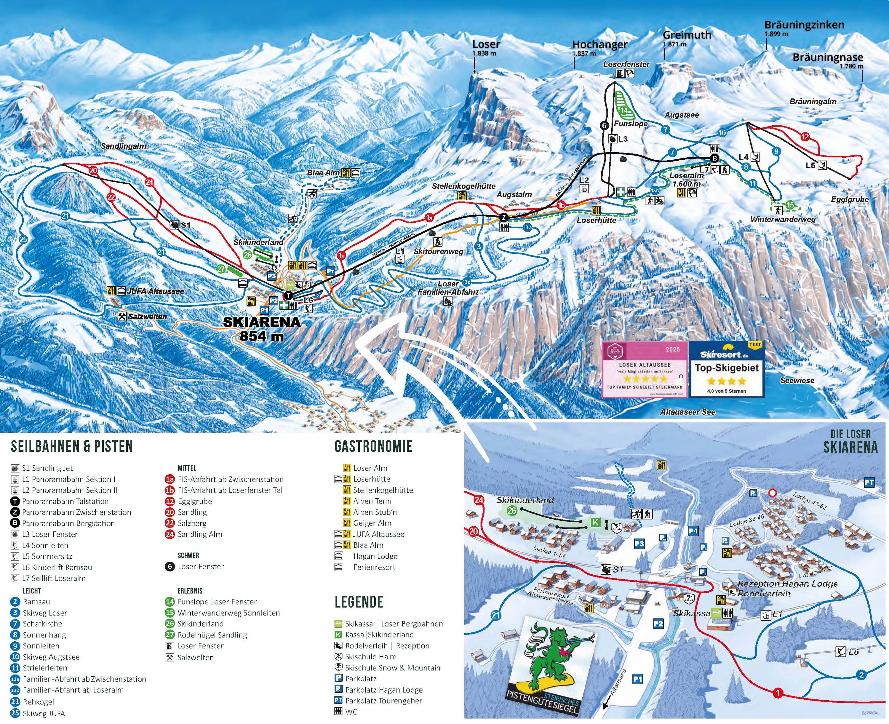 Der Pistenplan stellt das komplette Skigebiet Loser gut dar. Es sind alle Lifte, Pisten und Skipasspreise angegeben. Auf der Rückseite findet man Informationen zu den Hütten, Veranstaltungen und Unterkünften.