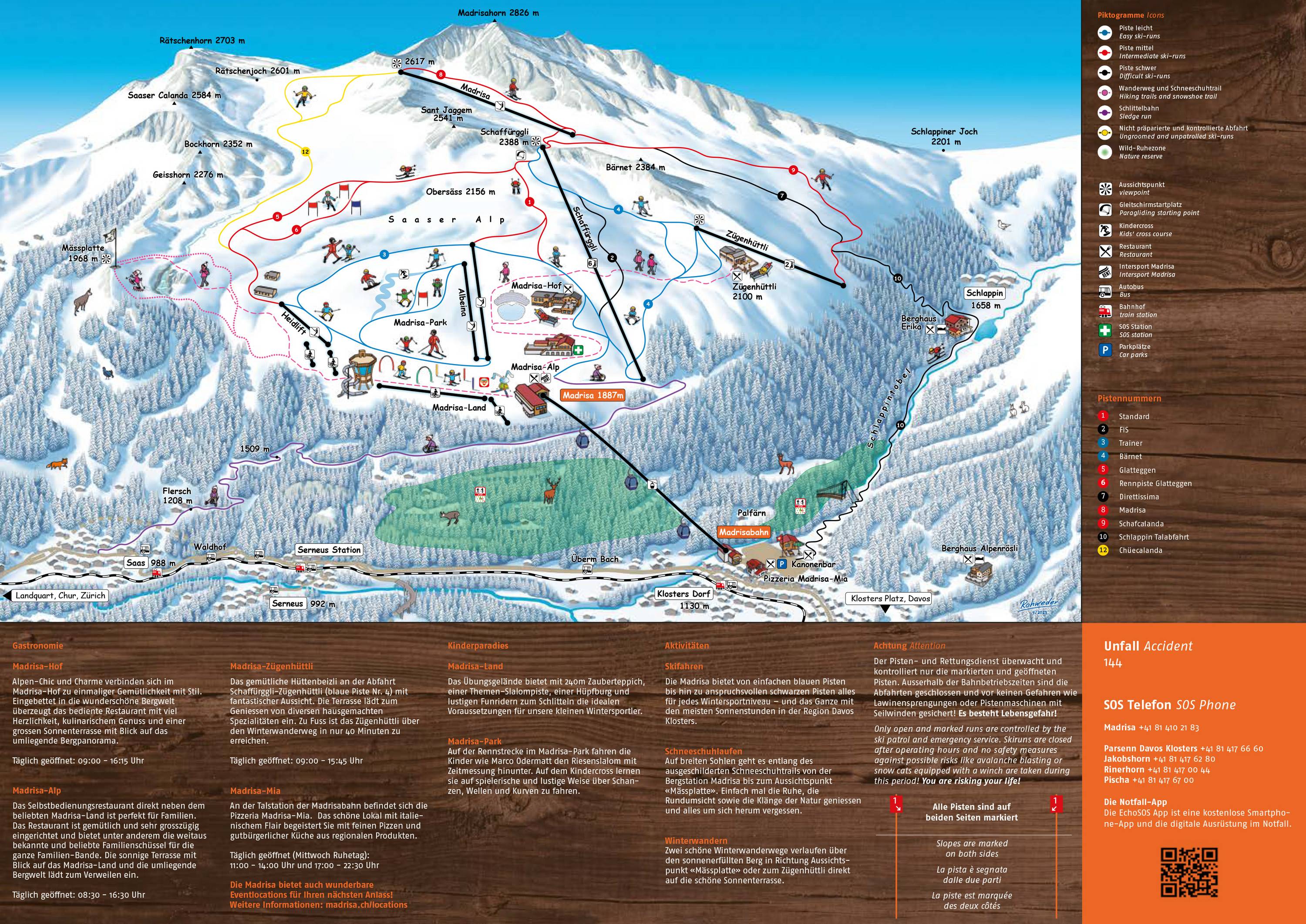 Orientierung (Pistenplan, Informationstafeln, Ausschilderung) und Sicherheit im Skigebiet Madrisa (Davos Klosters)