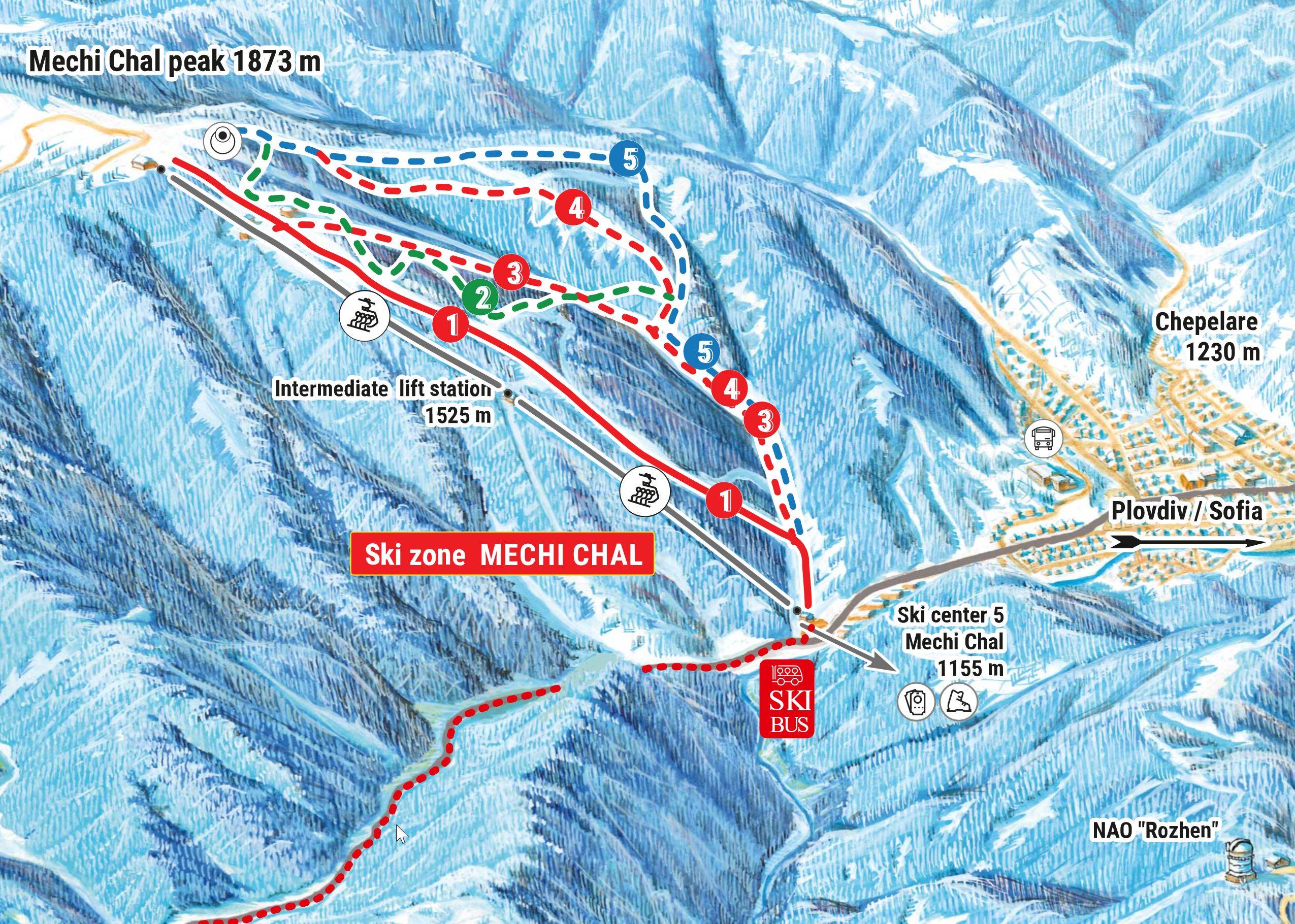 Der Pistenplan bildet das Skigebiet Pamporovo und Mechi Chal gemeinsam ab. Die rote Hauptpiste und die Sesselbahn sind gut zu erkennen. Die anderen Pisten sind nur gestrichelt eingezeichnet.