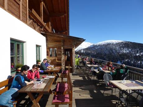 Das Skigebiet Meran 2000 trumpft mit urigen und gemütlichen Hütten auf. Südtiroler Spezialitäten und große Sonnenterrassen laden zum Verweilen ein. Die Einkehrmöglichkeiten sind gleichmäßig im gesamten Skigebiet verteilt.