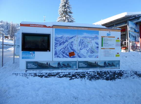 Zahlreiche Info-Points und Informationstafeln im Skigebiet erleichtern die Orientierung. Die Informationstafel an der Zentralkasse bietet zudem detaillierte Betriebsinformationen.