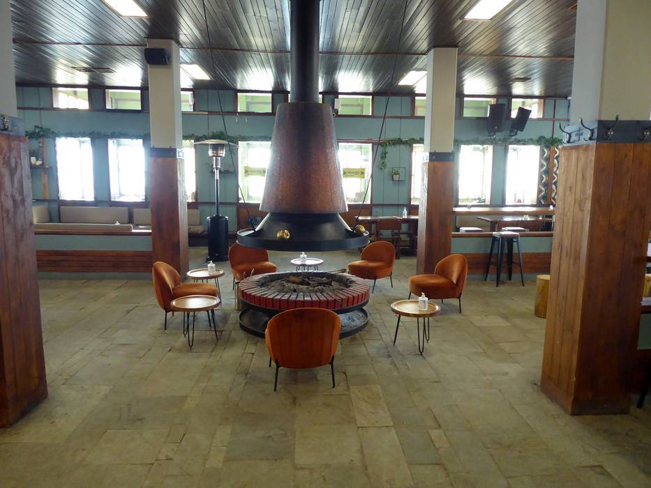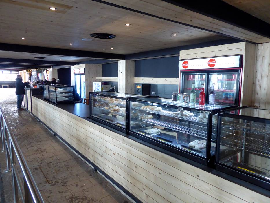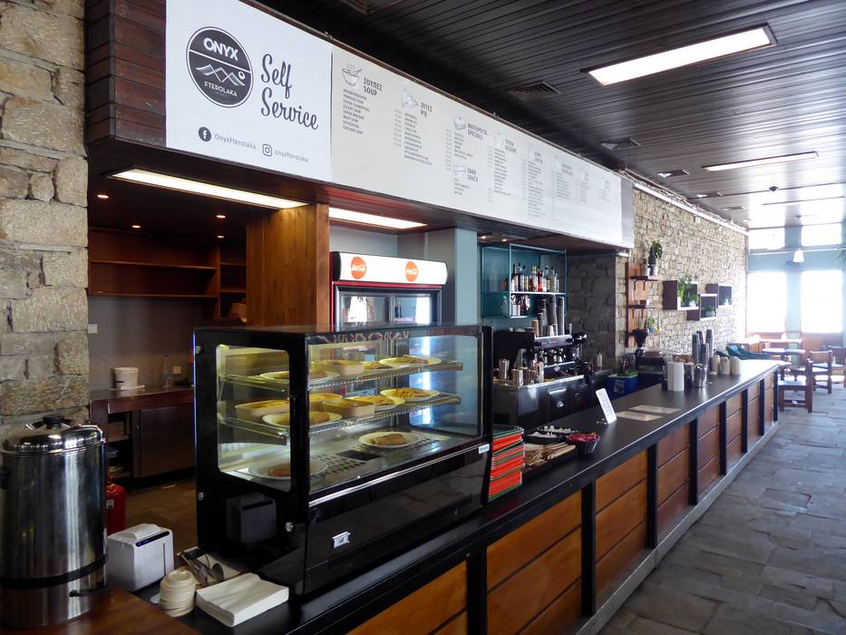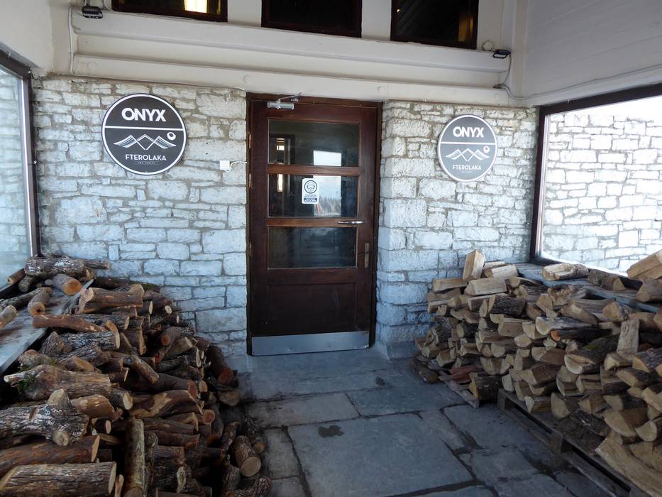 Das Fterolakka Chalet bietet ein Selbstbedienungsrestaurant mit eher kleinen Snacks und eine Bar. Am offenen Kamin kann man sich aufwärmen.
