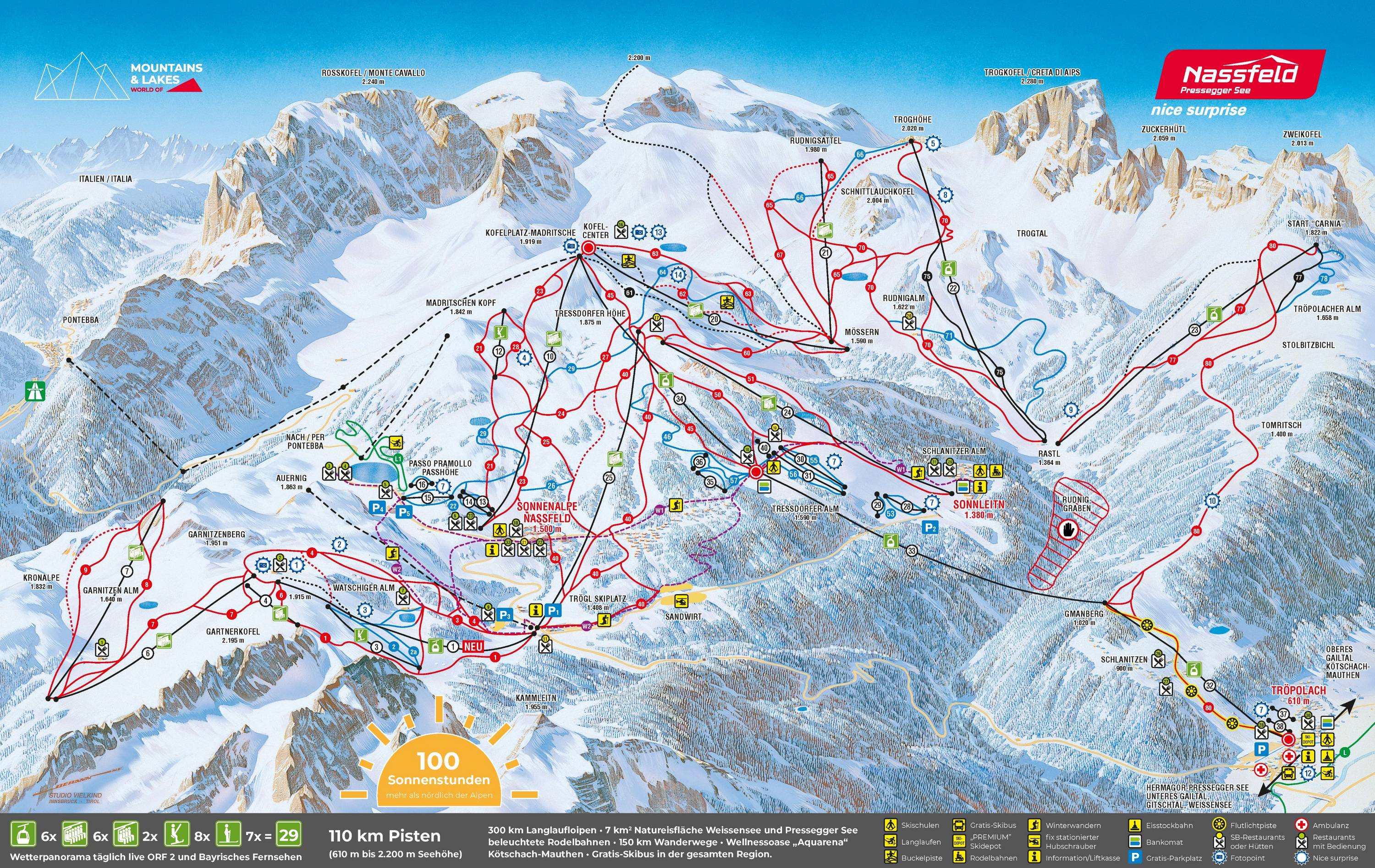 Der Pistenplan vom Nassfeld ist vorbildlich. Es sind alle Lifte mit Namen, Länge und Höhenunterschied eingezeichnet. Ebenso findet man alle Pisten mit Nummern, Namen und Länge. Alle Einkehrmöglichkeiten sind mit Foto und detaillierter Beschreibung aufgenommen. Weitere Informationen wie wichtige Telefonnummern, Höhenangaben und vieles mehr findet man ebenfalls im Pistenplan. Die Highlights auf der Piste sind vorbildlich platziert und damit leicht zu finden.