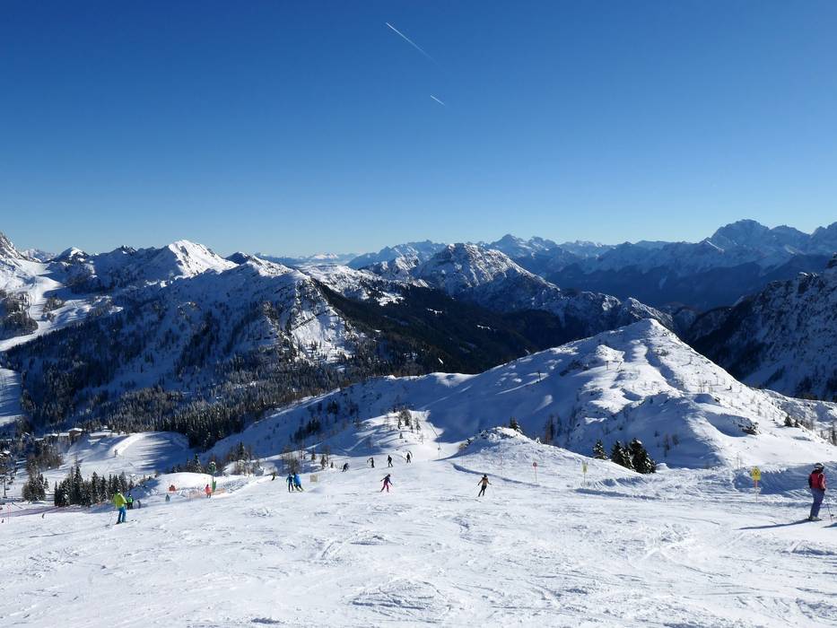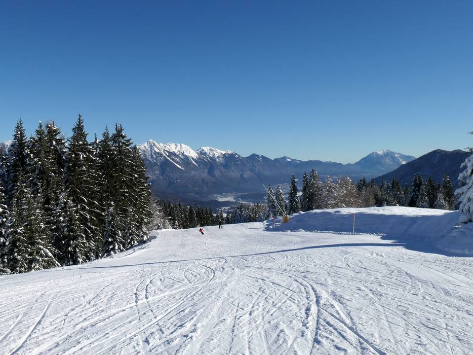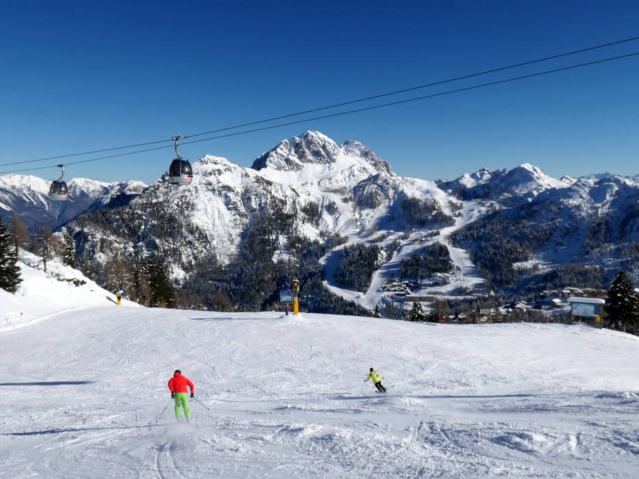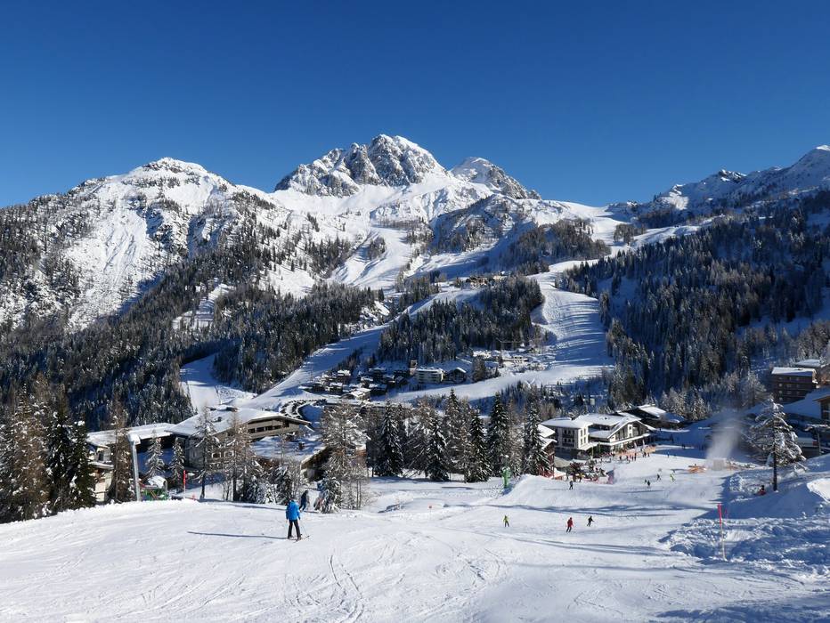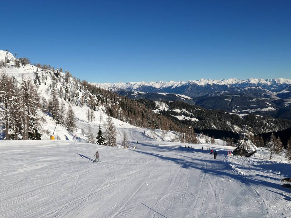 Eine beschneite Talabfahrt führt nach Tröpolach. Die Sonnenalpe Nassfeld und Sonnleitn liegen mitten im Skigebiet.