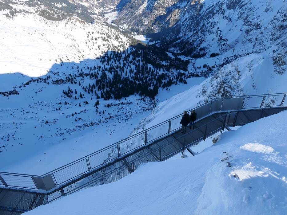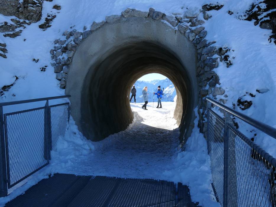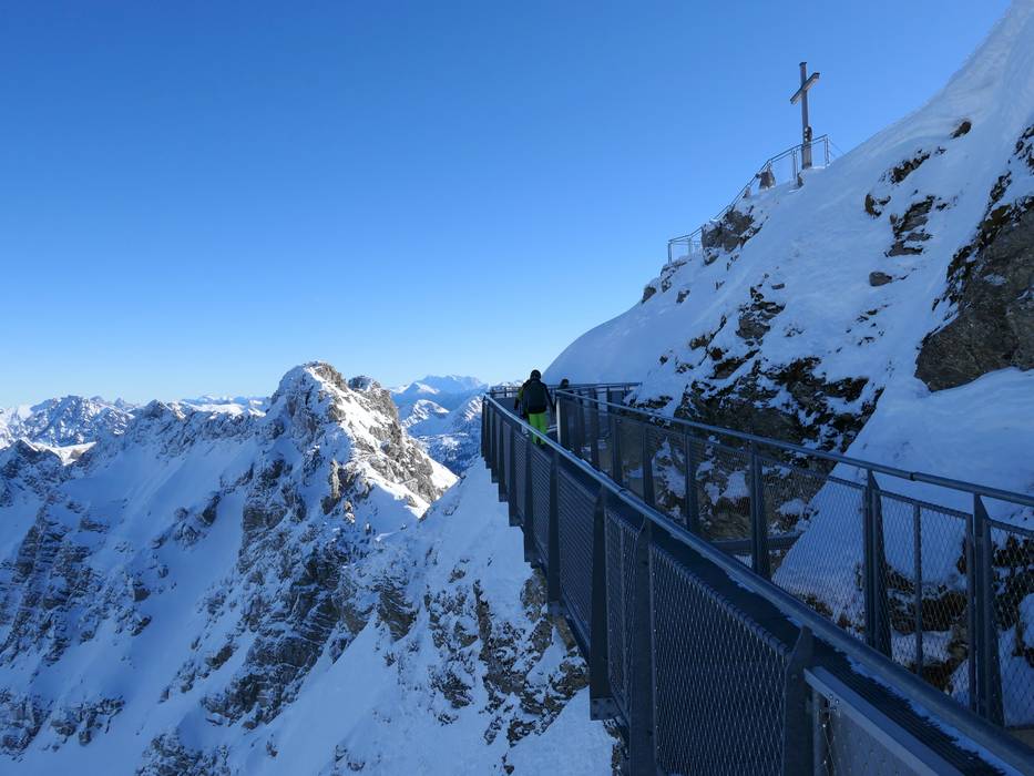 Der Nordwandsteig garantiert einen atemberaubenden Ausblick vom Nebelhorn. Durch einen Tunnel kommt man zu einer beeindruckenden Stahl-Konstruktion, die in der Nebelhorn Nordwand befestigt ist und mit der man den kompletten Gipfel umrunden kann. 600 m tief geht der Blick an der Nordwand nach unten.