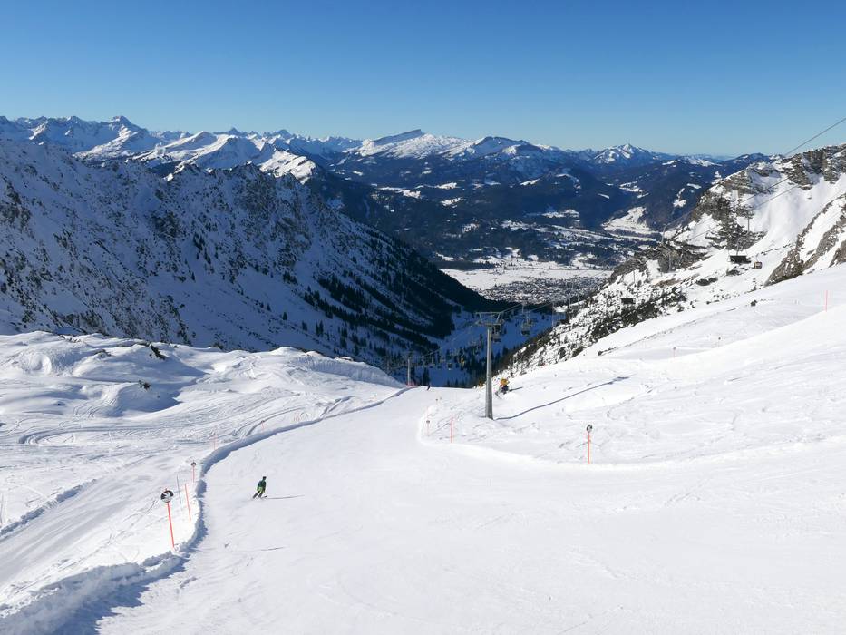 Könner und Freerider finden am Nebelhorn tolle Angebote. Für Könner sind insbesondere der 700 m lange hochalpine Nebelhorn-Gipfelhang sowie die schwarzen Pisten an der 10er-Gondelbahn Nebelhorn 2 zu empfehlen. Diese sind richtig steil. Das Ganze kann man natürlich auch kombinieren: Mit 7,5 km Länge befindet sich am Nebelhorn die längste beschneite Talabfahrt Deutschland. Erst der steile Nebelhorn-Gipfelhang, dann die schwarzen Pisten Sonngehren und Talabfahrt Seealpe und schließlich noch die mittelschwere Talabfahrt nach Oberstdorf. 1400 Höhenmeter am Stück! Dank der neuen 10er-Gondelbahn geht es wieder zügig aufwärts für Wiederholungen. Im gesamten oberen Bereich sind außerdem viele ungesicherte Freeridemöglichkeiten gegeben.