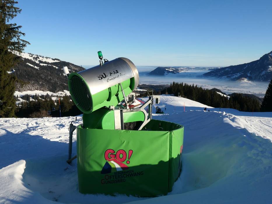 Das Skigebiet hat eine der leistungsstärksten Beschneiungsanlagen im Allgäu. Fast alle Pisten sind beschneit und es gibt einen sehr großen Speicherteich.