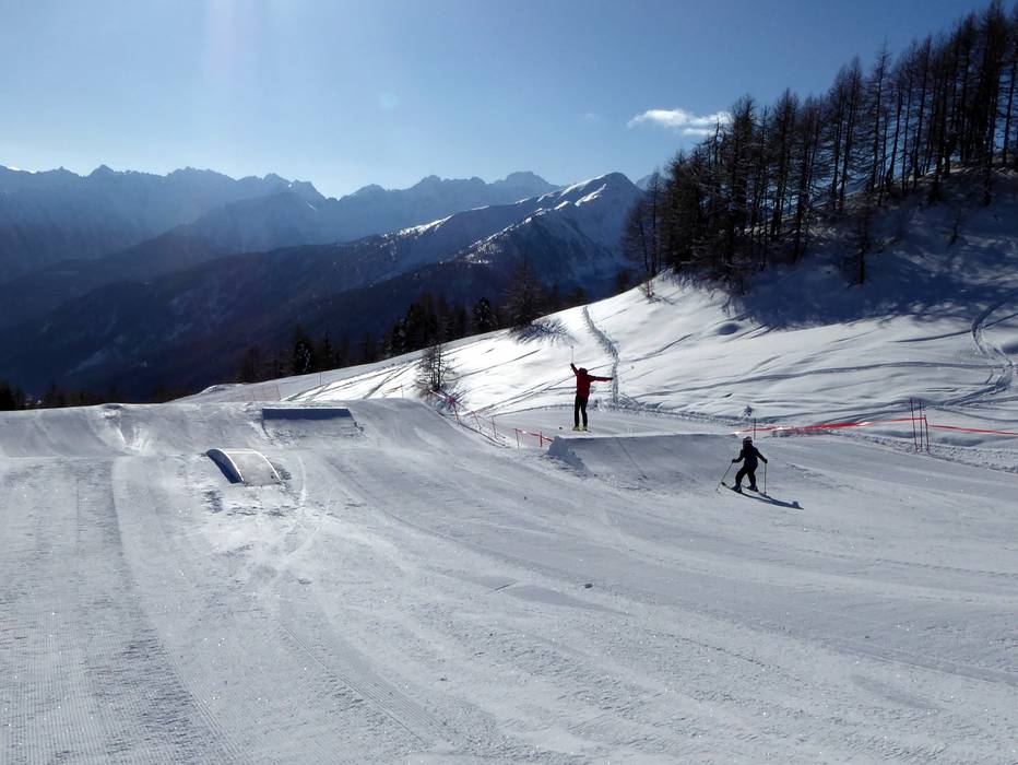 Das Skigebiet Pejo bietet einen kleinen Snowpark für Familien und parallel dazu eine Funslope.
