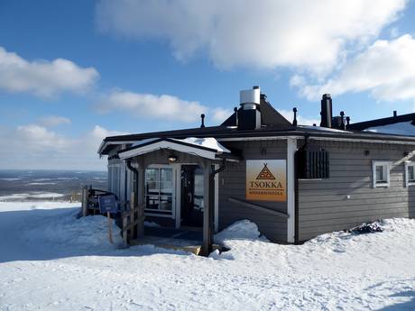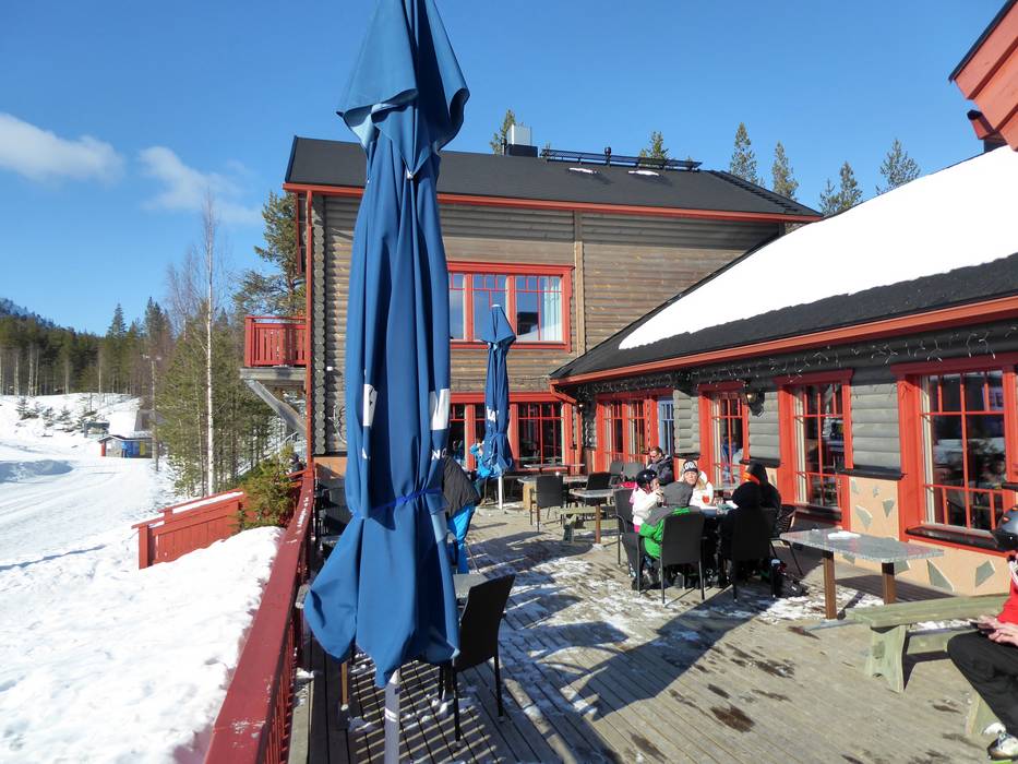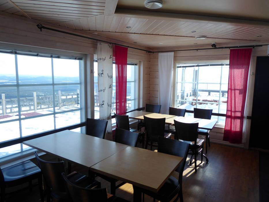 Die höchste Einkehrmöglichkeit im Skigebiet von Pyhä befindet sich auf dem Gipfel des Kultakero. Es ist ein stimmungsvolles Restaurant in einer lappländischen Hütte. Die große Terrasse bietet einen herrlichen Blick über Lappland und wenn es klar ist sogar bis nach Russland.