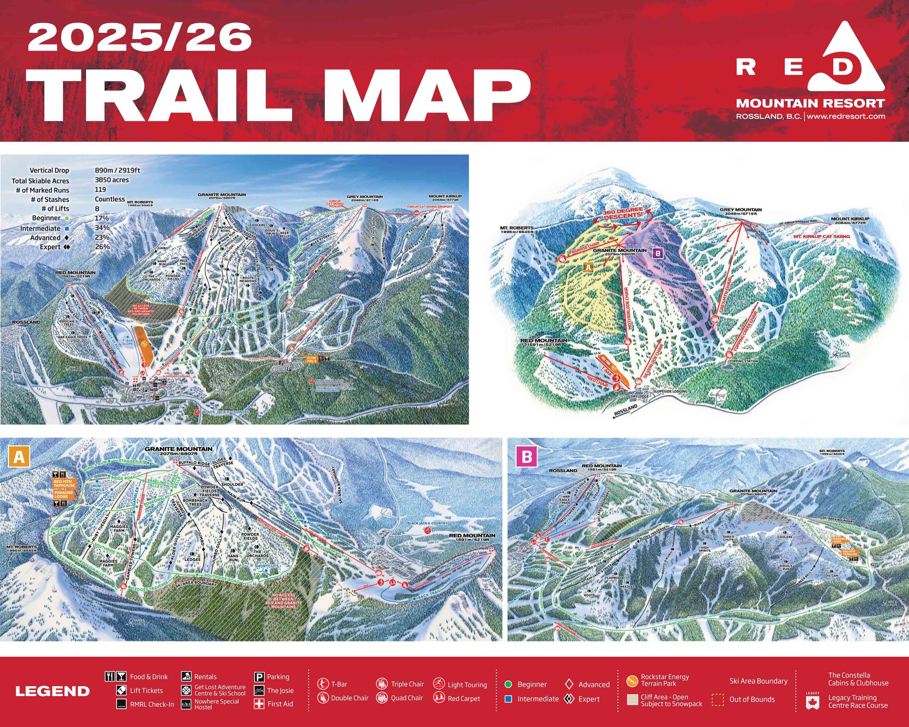 Der Pistenplan vom Red Mountain Resort zeigt mehrere Seiten des Skigebiets: die Gesamtübersicht (Front mit Red, Granite, Grey und Kirkup), Paradise und die Granite Bowl. Alle Abfahrten sind mit Namen und Schwierigkeitsgrad im Plan angegeben. Die Lifte sind ebenfalls alle mit eingezeichnet.