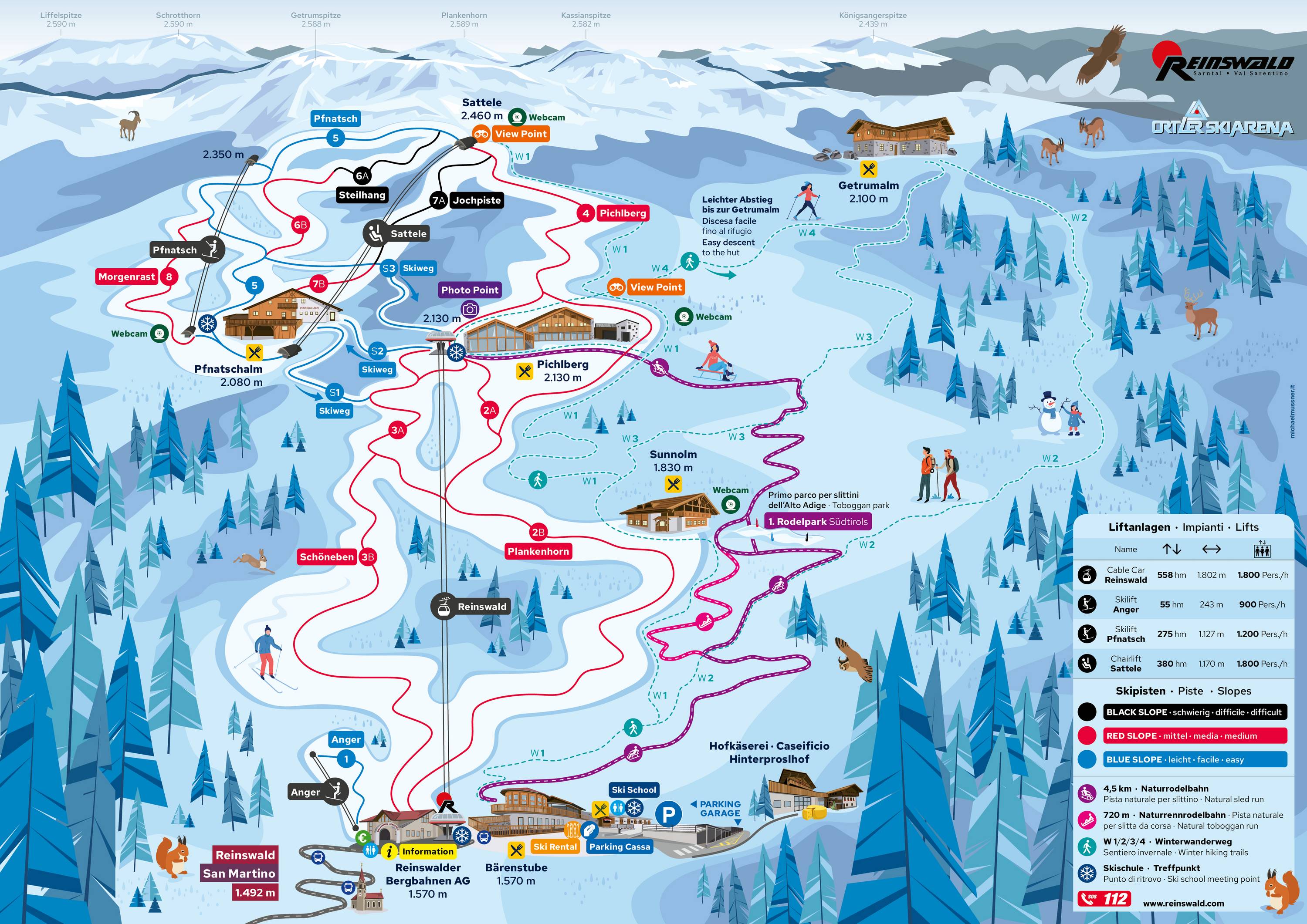 Der Pistenplan bildet das Skigebiet Reinswald sehr gut ab. Die Pisten, Lifte, Restaurants, Winterwanderwege, Skischulsammelplätze sowie die Rodelbahn sind klar und deutlich eingezeichnet.