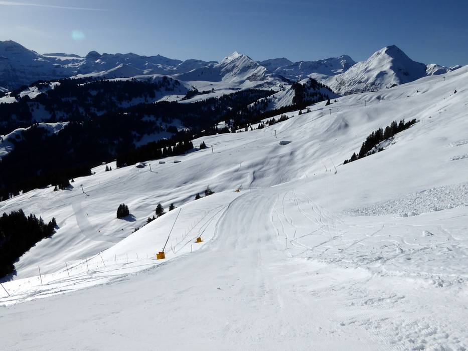 In die Orte St. Stephan, Zweisimmen, Saanenmöser und Schönried führen Talabfahrten. Bis auf die Talabfahrt nach St. Stephan sind die Pisten beschneit.