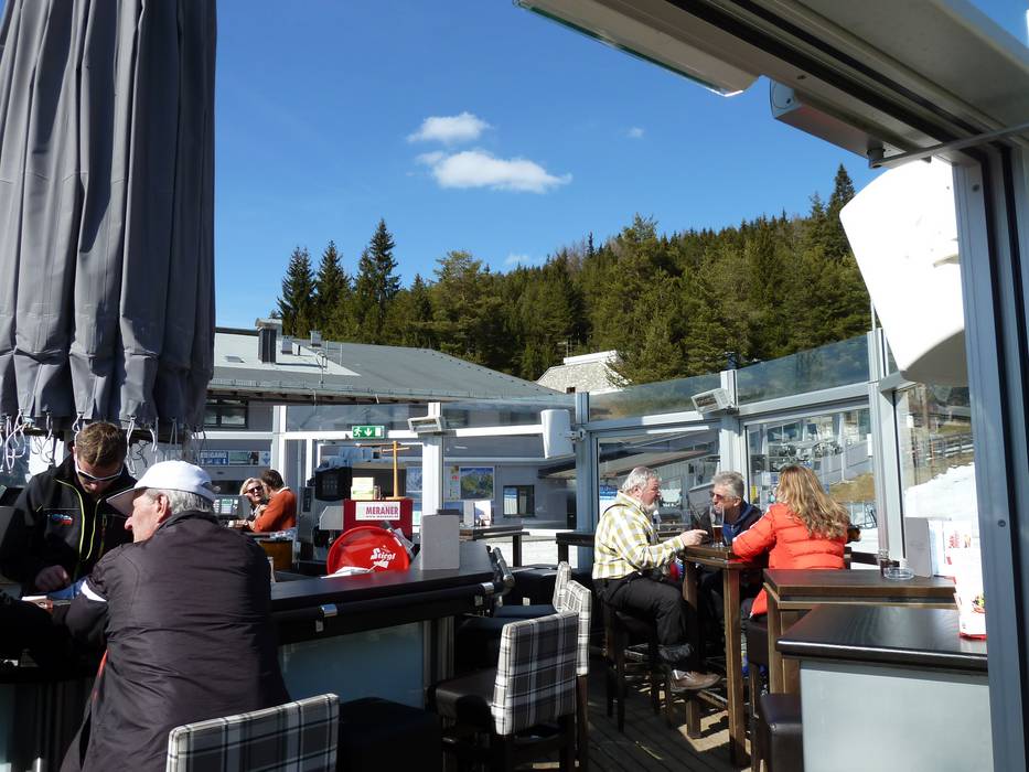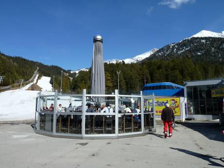Im Skigebiet Seefeld/Rosshütte geht es eher gemütlich zu. Man nutzt vor allem die großzügigen Sonnenterrassen für entspanntes Après-Ski. Am Murmelebau und an der Talstation gibt es auch Schirmbars.