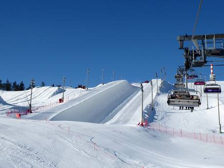 An der Piste 21 befindet sich der leichte Rosa Park mit leichten Obstacles für Anfänger. Hier kann man wunderbar die ersten Erfahrungen in einem Snowpark sammeln. Mit dem Bistro-Tellerlift erreicht man den Rosa Park sehr bequem für weitere Fahrten.