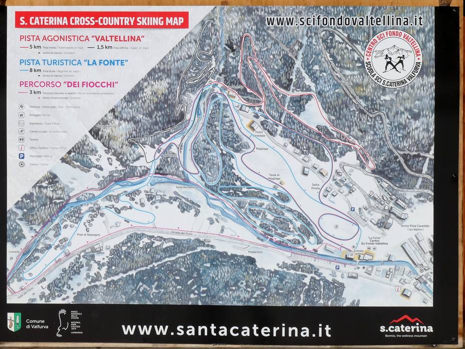 Das Langlaufzentrum Santa Caterina Valfurva bietet mehrere atemberaubende Loipen. Die schneesicheren Loipen auf ca. 1800 Höhenmeter decken aller Schwierigkeitsgrade ab. Somit kommen Anfänger bis erfahrene Langläufer auf den Rundkursen auf ihre Kosten. Auch internationale Wettkämpfe und Weltcup-Veranstaltungen finden hier statt. Eine Langlaufschule steht bereit. Das Langlaufzentrum bietet mit Umkleideräumen, Kleideraufbewahrung mit Schließfächern, öffentlichen Toiletten und angrenzender Gastronomie sehr viel Komfort.