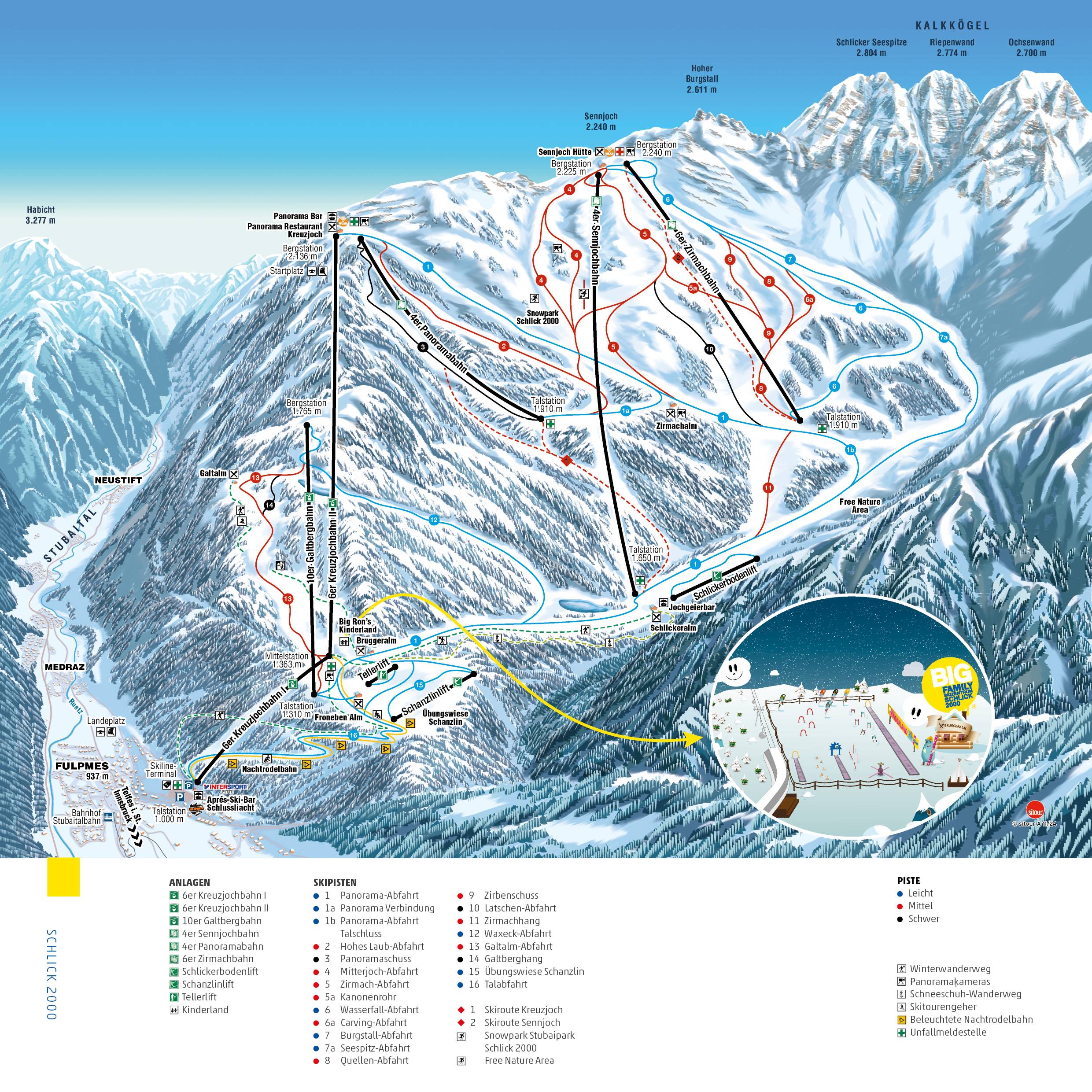 Der Pistenplan für das Skigebiet Schlick 2000 ist übersichtlich und auf dem neuesten Stand. Man kann sich damit sehr gut orientieren. Die Pisten und Lifte sind im Pistenplan einzeln gekennzeichnet und zusätzlich tabellarisch benannt. Auch die weitere Infrastruktur im Skigebiet ist leicht erkennbar dargestellt. Positiv ist auch, dass der Pistenplan als Faltplan in mehreren Sprachen zur Verfügung steht.