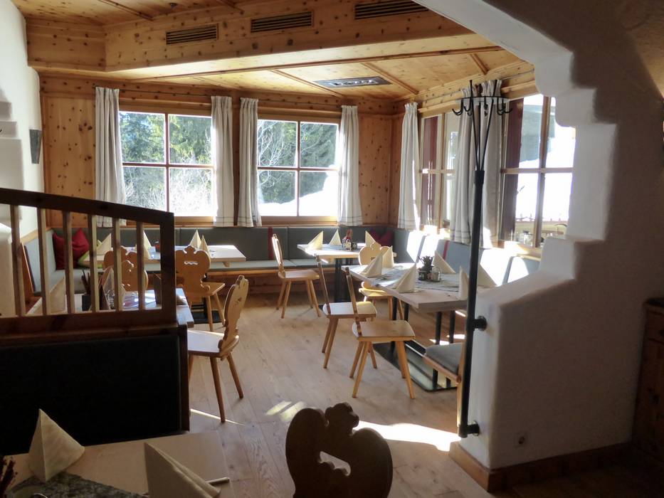 Die Schmiedhof Alm setzt bei der Architektur auf klare Linien und die Elemente Holz, Stein und Glas. Das Speiseangebot reicht von typischen Almgerichten über klassische Schmankerl bis hin zur modernen regionalen Küche. Einladend sind die extra, großen Fenster.