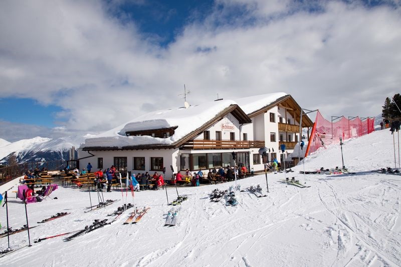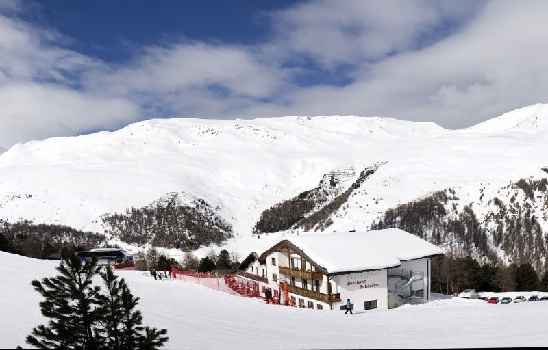 Eingebettet in die verschneite Berglandschaft des Vinschger Oberlandes liegt das Schihaus Schöneben auf 2.100 Höhenmetern mitten im Skigebiet.