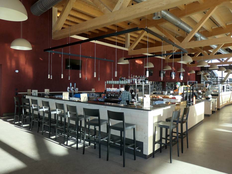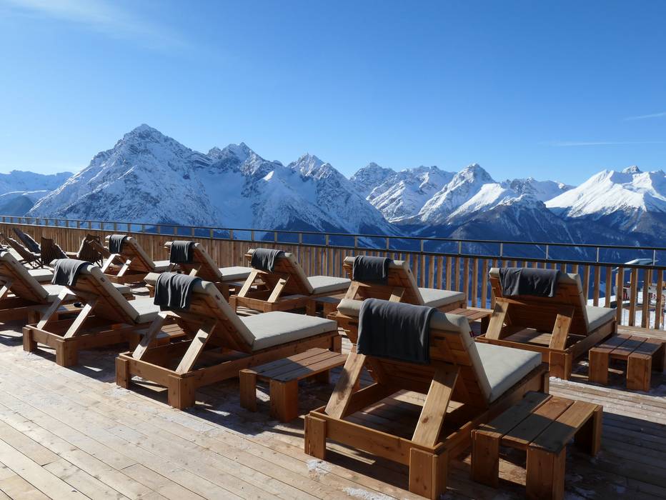 An der Bar im Bergrestaurant La Motta kann man wunderbar den Tag ausklingen lassen. In der Lounge oder in den Liegestühlen verweilt man genüsslich.