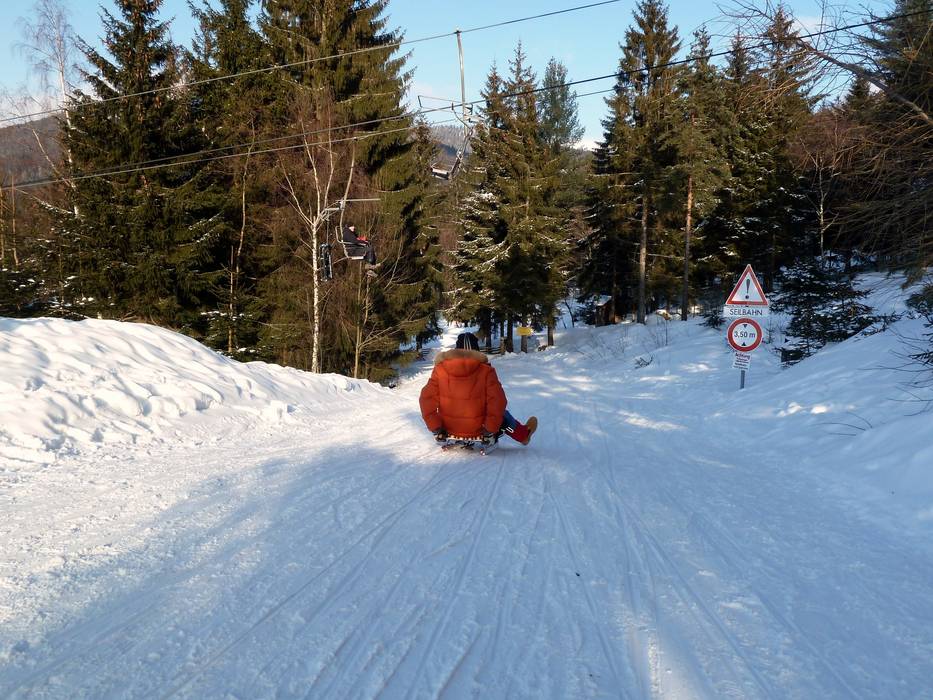 Die 600m lange Winterrodelbahn startet an der Mittelstation der Sesselbahn. Durch sanfte, unterstützende Beschneiung ist die Schneesicherheit gewährleistet. Rodel können an der Talstation geliehen werden und mit der Sesselbahn geht es aufwärts. Einen Zwischenstopp kann man bei der Bergmann-Schänke einlegen und den herrlichen Blick genießen. Ein Spaß für die ganze Familie.