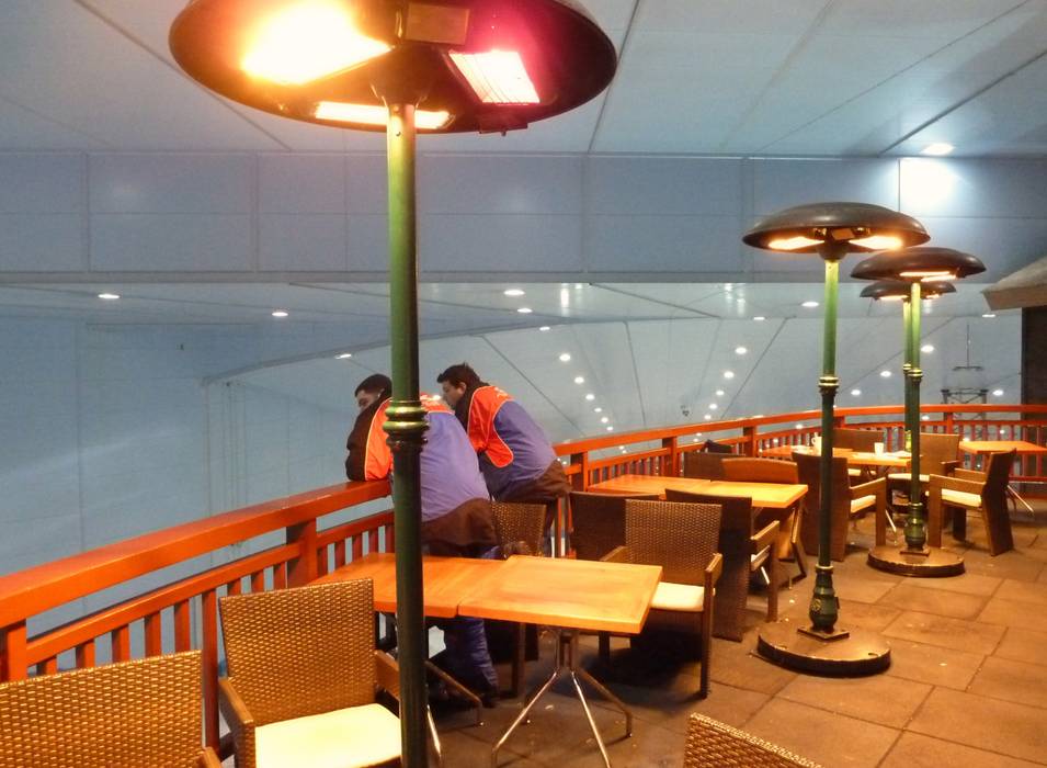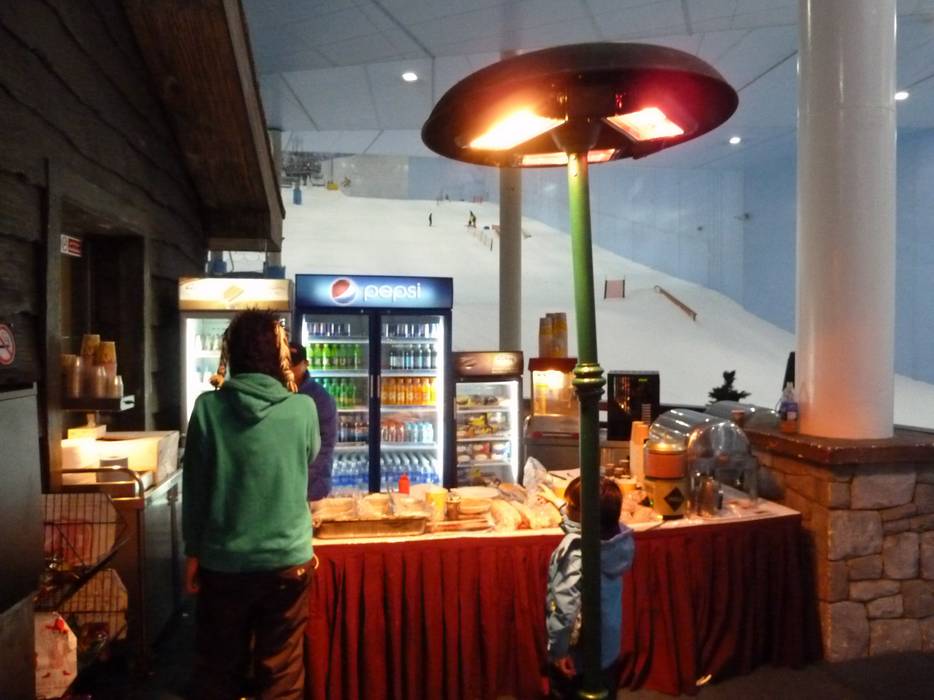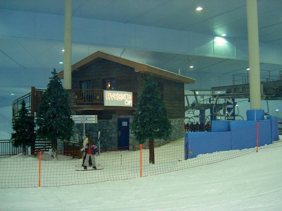 Das Avalanche Café ist im Stil einer Berghütte gebaut und liegt mitten auf den Pisten der Skihalle. Vom Balkon kann man das Treiben auf den Pisten beobachten. Es wird einem auch nicht kalt, da der Balkon mit Heizstrahlern beheizt wird.