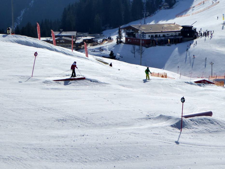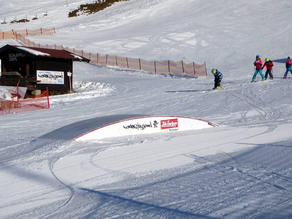 Der Einsteiger Snowpark befindet sich auf der Übungswiese im Tal von Westendorf. Es gibt mehrere Obstacles und eine Mini-Cross Line mit Steilkurven und Wellen.