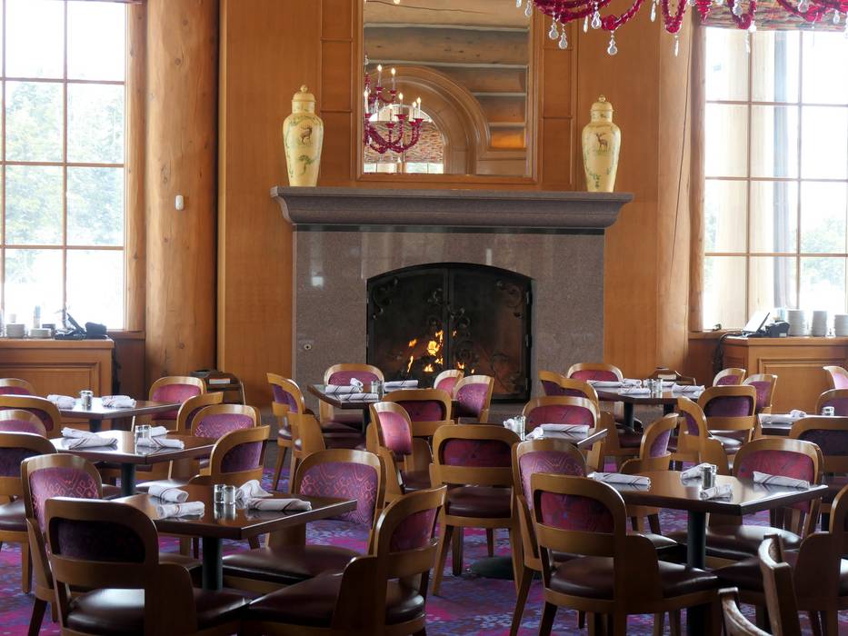 Die kreisförmige John Paul Lodge bietet einen herrlichen Panoramablick, bayerische und amerikanische Küche bei Selbstbedienung sowie knisternde Kamine.