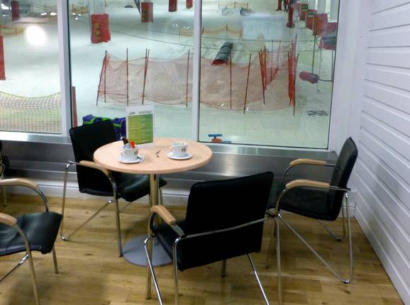 Man kann im Selbstbedienungsrestaurant den Tag mit einem Getränk Revue passieren lassen. Von dort hat man einen guten Blick auf das Skigebiet durch die Panoramafenster.