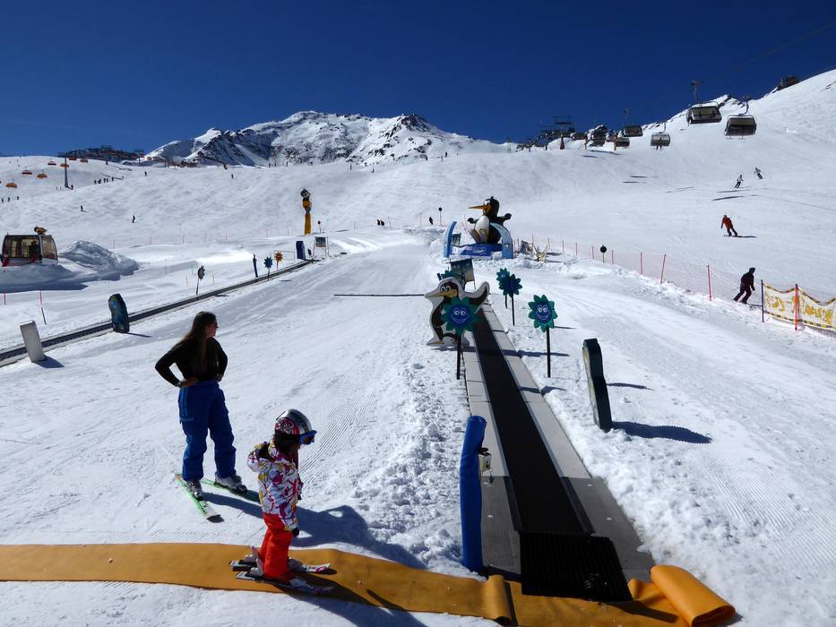 Das Kinderland liegt zentral an der Bergstation der Giggijochbahn und ist sehr gut ausgestattet. Die Kleinen fühlen sich am Förderband mit den lustigen Figuren sehr wohl.