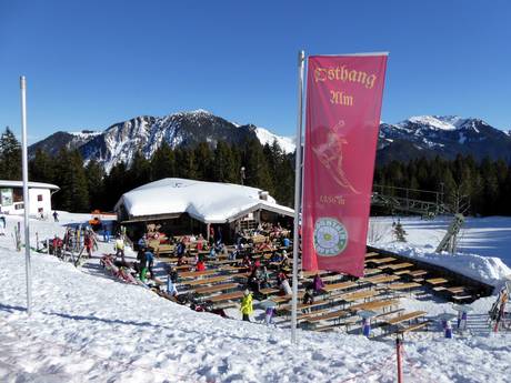 Die Osthang Alm ist eine sehr schöne Selbstbedieungshütte mit Bayerischen Schmankerln. In den gemütlichen und urigen Stuben kann man vorzüglich speisen. Das Angebot reicht von Suppen und Eintöpfen, über Tiroler Gröstl, Schnitzel, Kasspatzen, bis hin zu Mountain Burgern. Bei schönem Wetter lockt die große Sonnenterrasse mit Blick auf den Osthang.