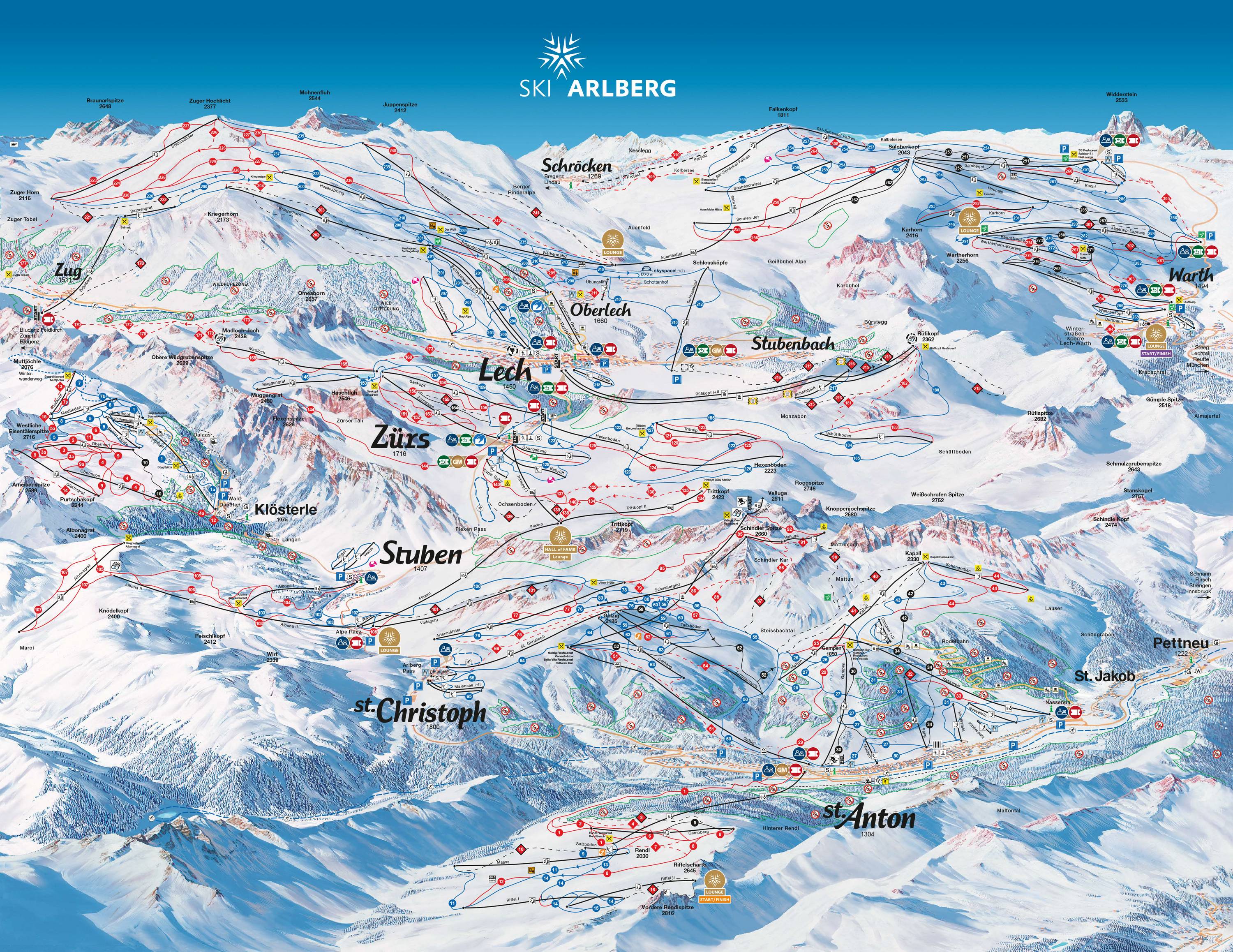 Der Ski Arlberg Pistenplan stellt das gesamte Skigebiet umfassend dar. Es sind alle Skilifte und Pisten im Detail angegeben. Durch das große Pisten- und Liftangebot ist der Pistenplan sehr groß geworden und es sind daher viele Informationen angegeben.