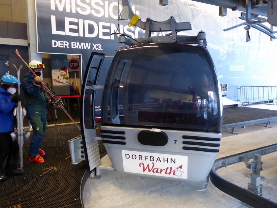 Mit einer 8er-Gondelbahn vom Dorfzentrum Warth auf die Piste