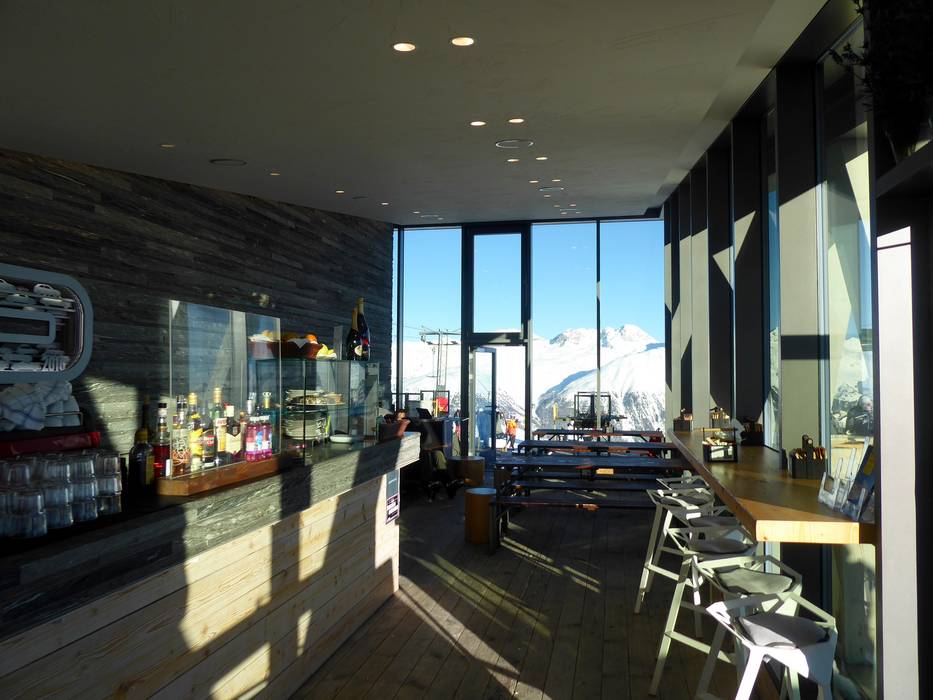 Die Design-Bar ist ein puristischer Bau aus Naturstein und Holz. Die stilvolle Bar mit gemütlichen Sitzplätzen lädt zum gemütliche Après-Ski ein. Leckere Drinks und Snacks runden das Angebot ab.