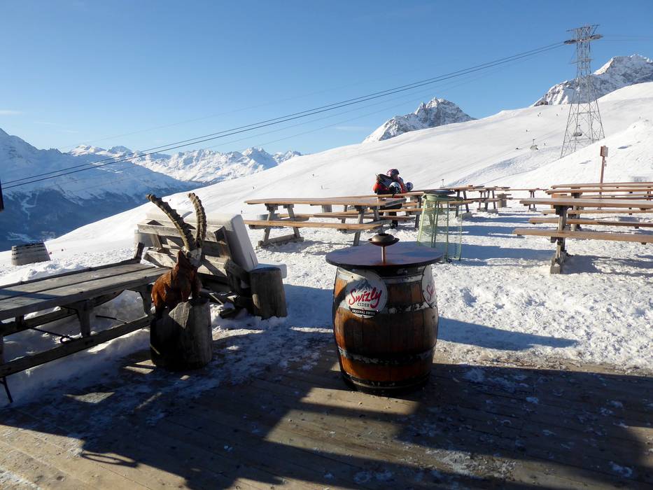 An der Schneebar der Alpina Hütte oder im Sonnenstuhl kann man den Skitag wunderbar ausklingen lassen und den herrlichen Ausblick auf das Engadin genießen. Man muss aber immer noch um 16 Uhr ins Tal abfahren.