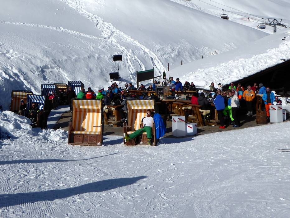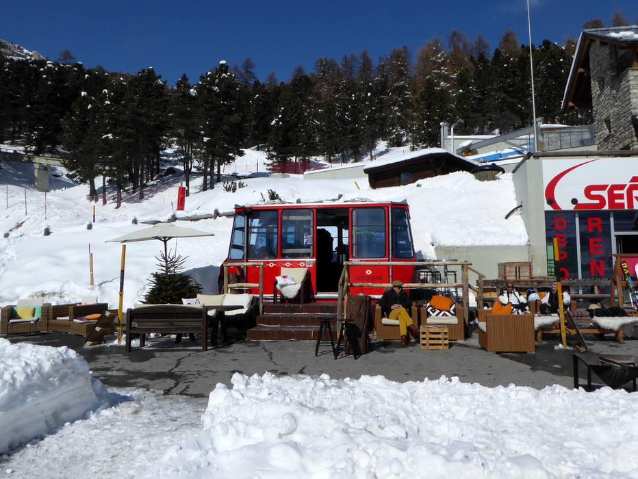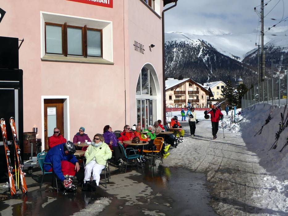 An der Schneebar der Alpina Hütte oder im Sonnenstuhl kann man den Skitag wunderbar ausklingen lassen und den herrlichen Ausblick auf das Engadin genießen. Man muss aber immer noch um 16 Uhr ins Tal abfahren.