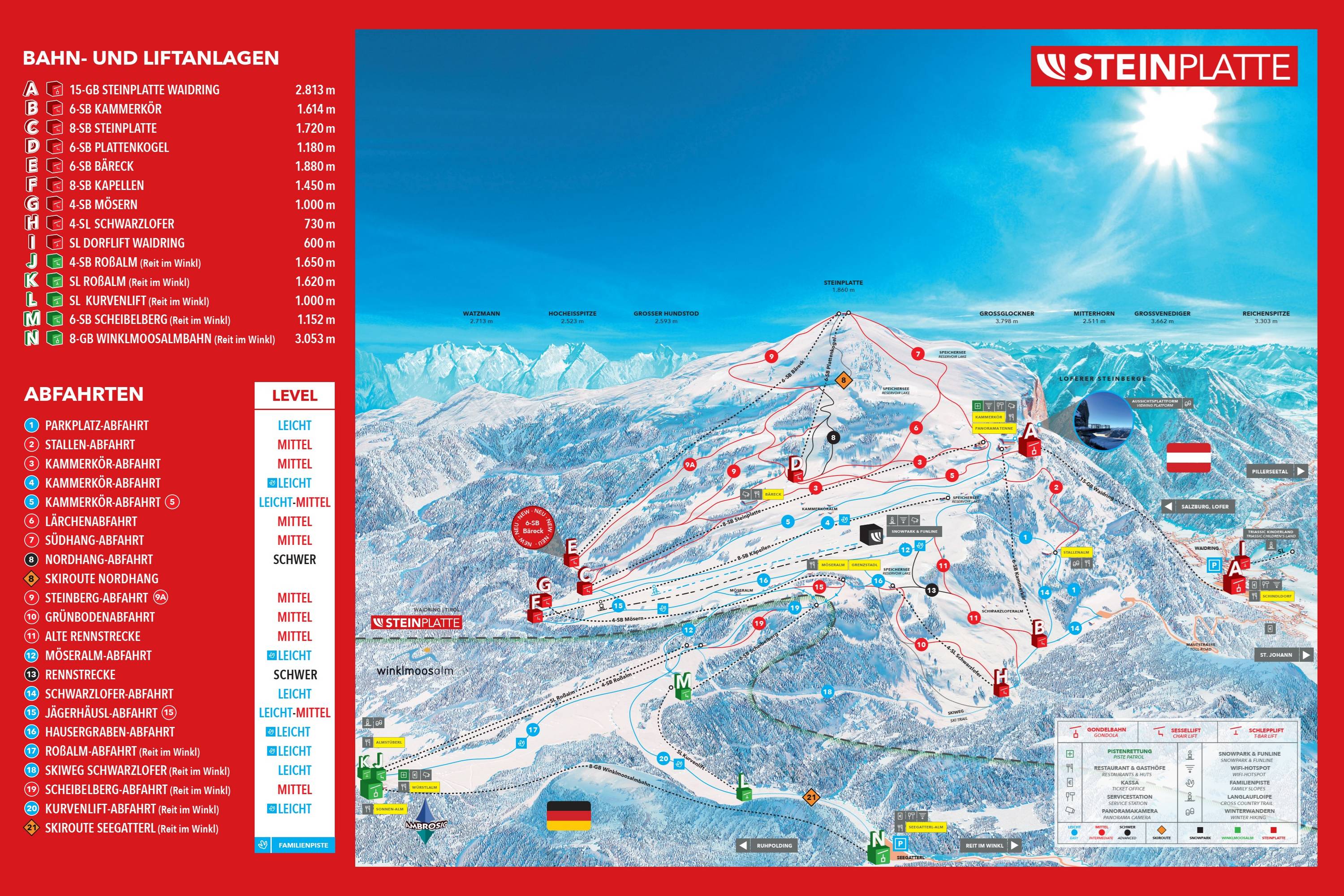 Orientierung (Pistenplan, Informationstafeln, Ausschilderung) und Sicherheit im Skigebiet Steinplatte Winklmoosalm – Waidring/​Reit im Winkl