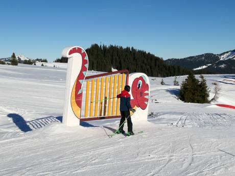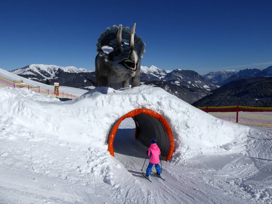 Die Funline mit Dinosaurier liegt direkt am Snowpark. Die "Spaßpiste" besteht aus Wellenbahnen, Steilkurven, einer Schnee-Schnecke mit Tunnel und weiteren Schneeelementen wie kleinen Sprüngen, Slideelementen und Slalom. Spaß für alle garantiert!