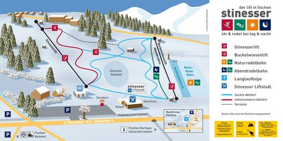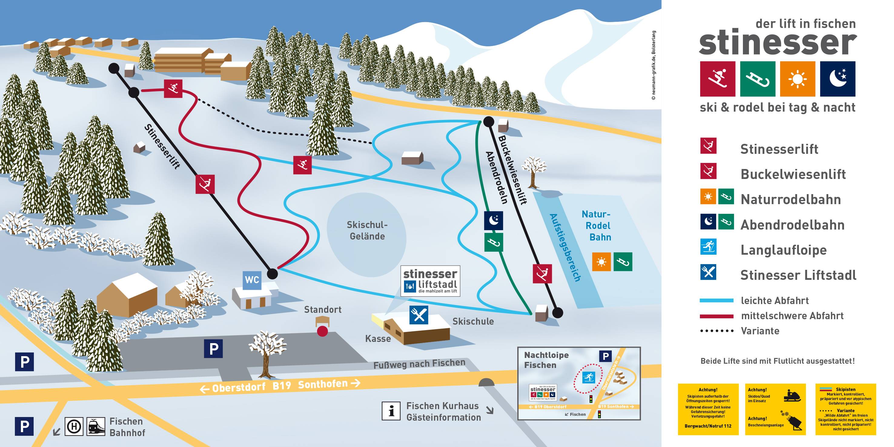 Orientierung (Pistenplan, Informationstafeln, Ausschilderung) und Sicherheit im Skigebiet Stinesser Lifte – Fischen i. Allgäu