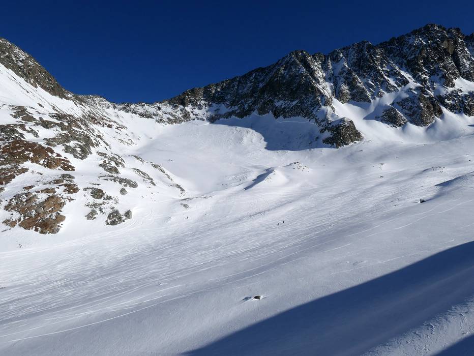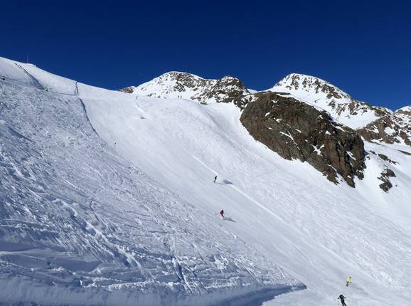 Der Stubaier Gletscher bietet auch für Könner und Freerider ein umfassendes Angebot. So zum Beispiel die schwarze Piste Daunhill mit 60% Neigung oder die lange und attraktive Skiroute Wilde Grube zur Talstation.