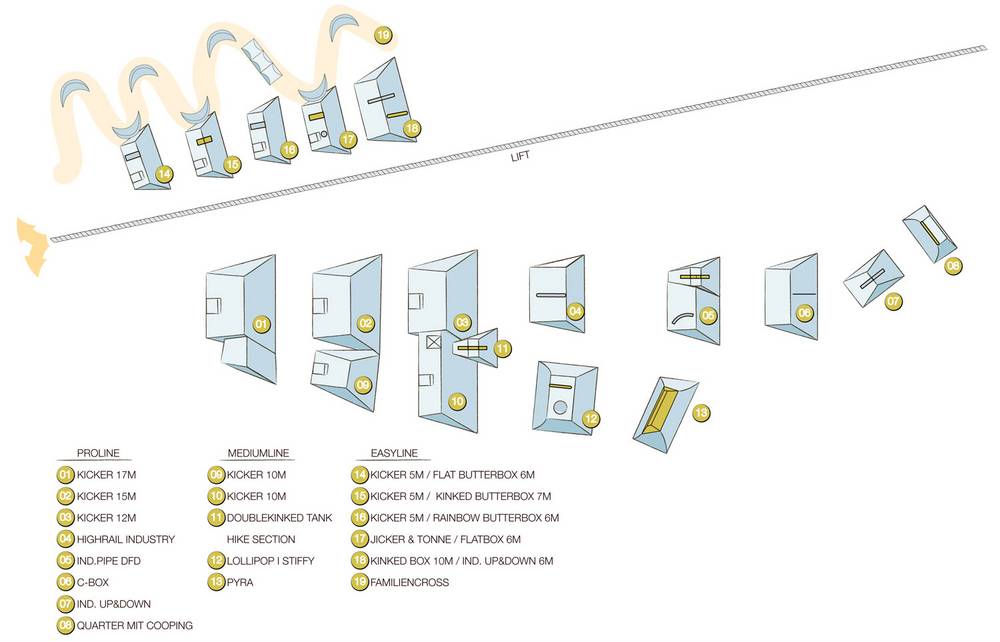 3er Kickerline, Rails und Boxen locken die Freerider an den Gaisskarferner