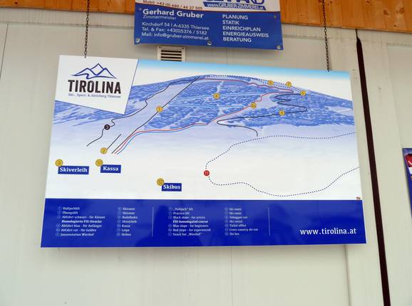 Der Pistenplan bildet das Skigebiet Tirolina gut ab. Es sind Preise und weitere Informationen mit angegeben.