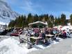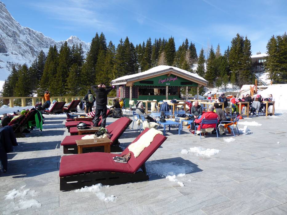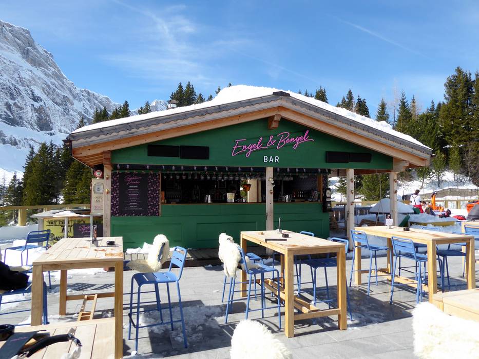 Auf der Sonnenterrasse am Trübsee kann man den Skitag wunderbar an der Engel & Bengel Bar ausklingen lassen. An den Wochenenden spielen Bands oder ein DJ legt auf. Der ideale Platz zum Après-Ski vor der Talabfahrt.